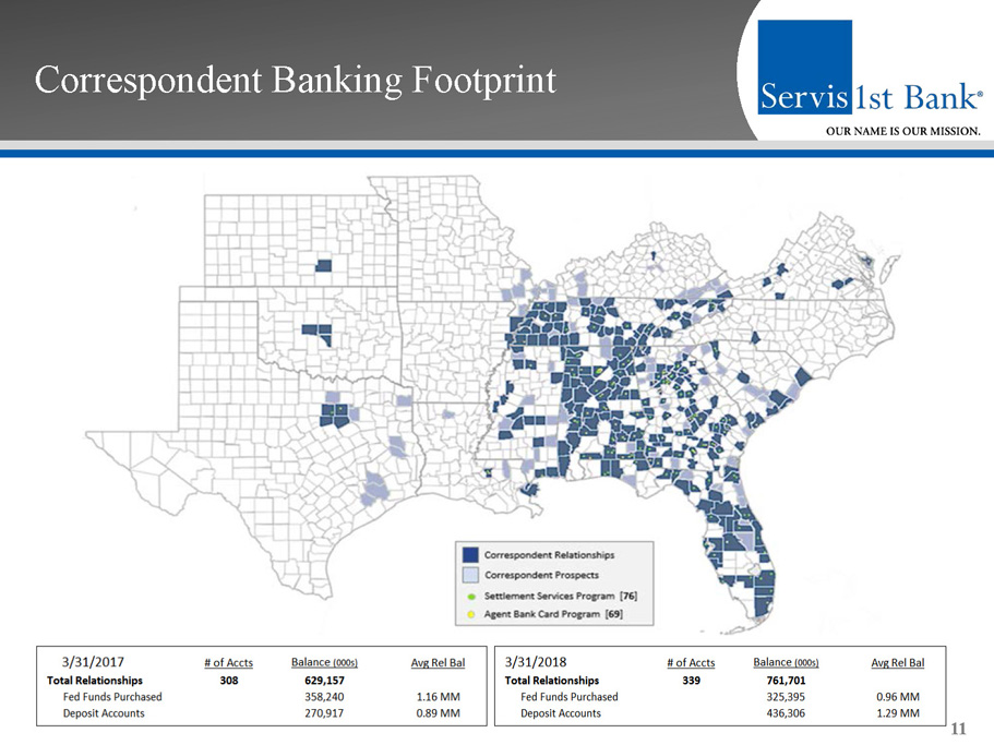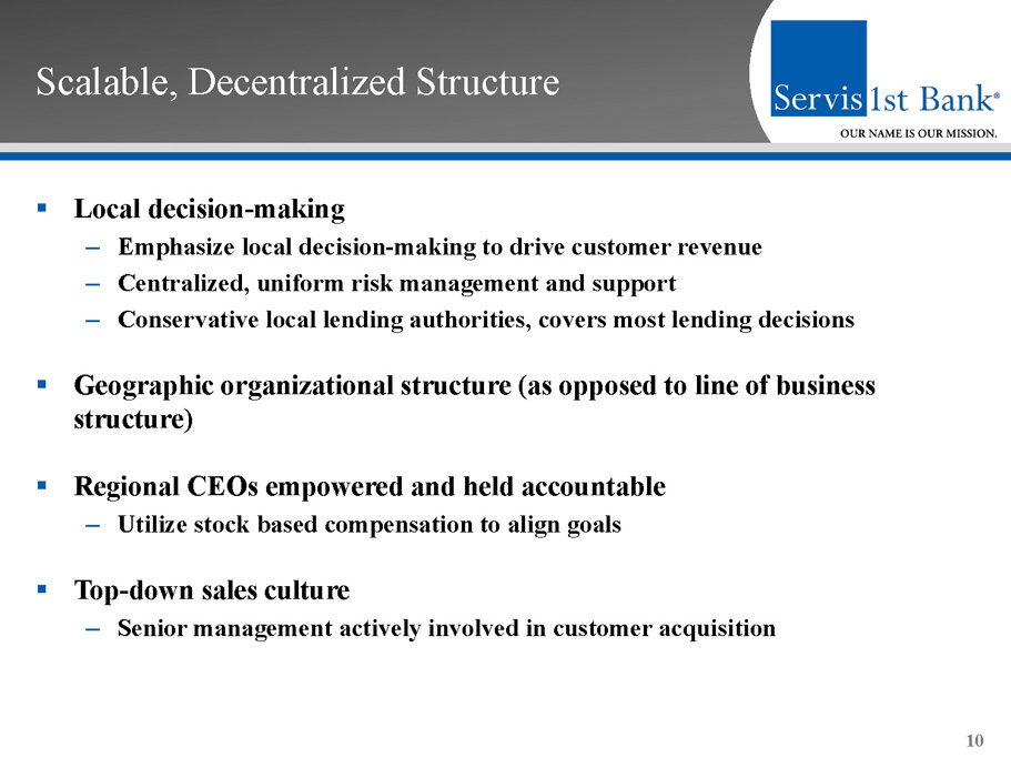 Scalable, Decentralized Structure ▪ Local decision - making – Emphasize local decision - making to drive customer revenue – Centralized, uniform risk management and support – Conservative local lending authorities, covers most lending decisions ▪ Geographic organizational structure (as opposed to line of business structure) ▪ Regional CEOs empowered and held accountable – Utilize stock based compensation to align goals ▪ Top - down sales culture – Senior management actively involved in customer acquisition 10