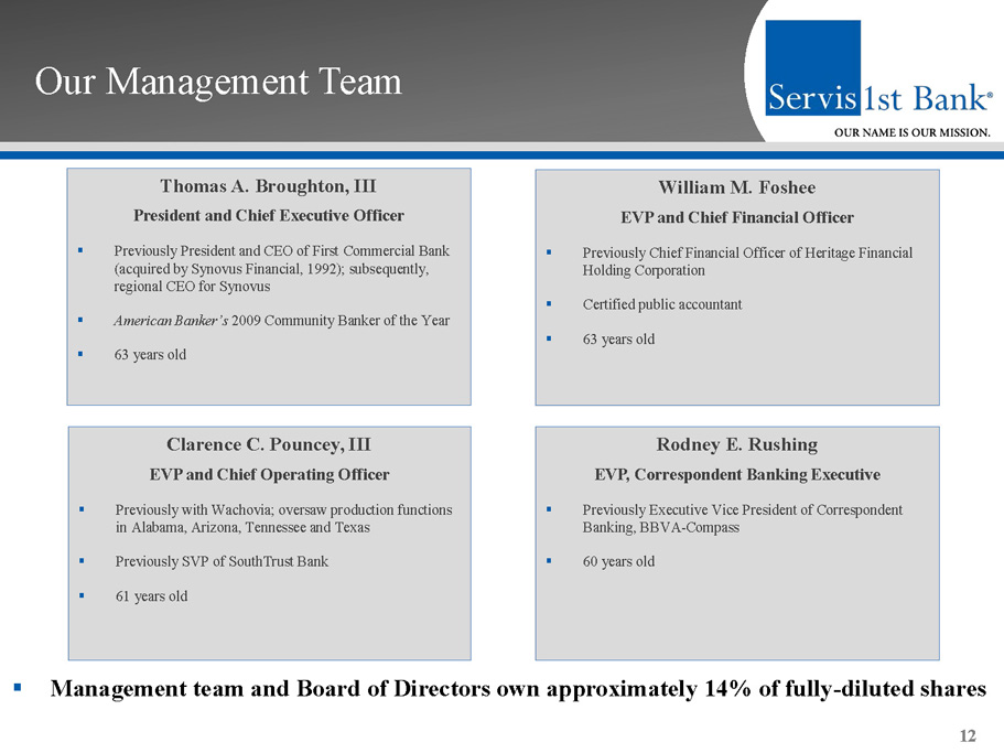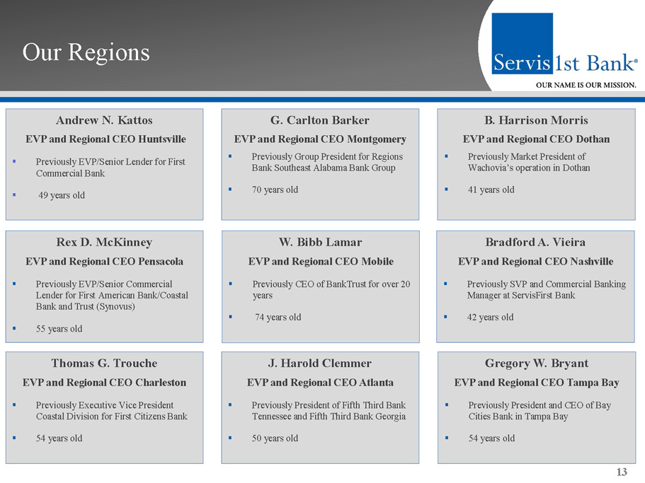 Our Management Team Thomas A. Broughton, III President and Chief Executive Officer ▪ Previously President and CEO of First Commercial Bank (acquired by Synovus Financial, 1992); subsequently, regional CEO for Synovus ▪ American Banker’s 2009 Community Banker of the Year ▪ 63 years old 12 William M. Foshee EVP and Chief Financial Officer ▪ Previously Chief Financial Officer of Heritage Financial Holding Corporation ▪ Certified public accountant ▪ 63 years old Clarence C. Pouncey , III EVP and Chief Operating Officer ▪ Previously with Wachovia; oversaw production functions in Alabama, Arizona, Tennessee and Texas ▪ Previously SVP of SouthTrust Bank ▪ 61 years old Rodney E. Rushing EVP, Correspondent Banking Executive ▪ Previously Executive Vice President of Correspondent Banking, BBVA - Compass ▪ 60 years old ▪ Management team and Board of Directors own approximately 14% of fully - diluted shares