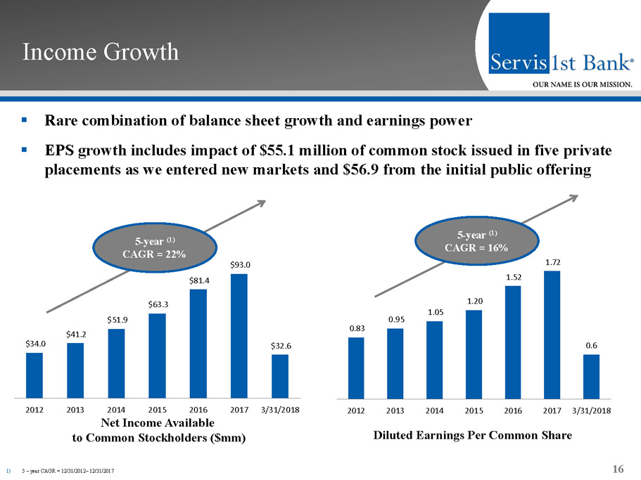 Balance Sheet Growth 15 5 - year (1) CAGR = 20% 5 - year (1) CAGR = 19% Gross Loans ($mm) Total Deposits ($mm) ▪ Organic growth of gross loans and total deposits in the 20% range ▪ 5 - year (1) CAGR of non - interest bearing deposits = 21% ▪ 5 - year (1) CAGR of C&I loans = 17% $2,363 $2,859 $3,360 $4,216 $4,912 $5,851 $5,928 2012 2013 2014 2015 2016 2017 3/31/2018 1) 5 – year CAGR = 12/31/2012 – 12/31/2017 $2,512 $3,020 $3,398 $4,224 $5,420 $6,092 $5,977 2012 2013 2014 2015 2016 2017 3/31/2018