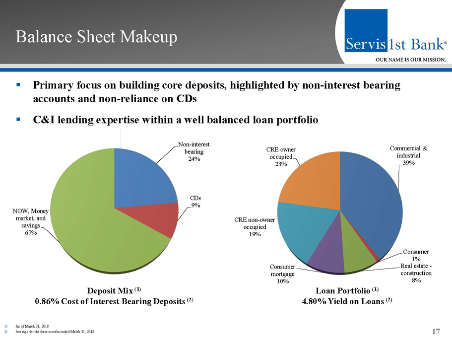 ▪ Rare combination of balance sheet growth and earnings power ▪ EPS growth includes impact of $55.1 million of common stock issued in five private placements as we entered new markets and $56.9 from the initial public offering Income Growth 16 5 - year (1) CAGR = 22% 5 - year (1) CAGR = 16% Net Income Available to Common Stockholders ($mm) Diluted Earnings Per Common Share $34.0 $41.2 $51.9 $63.3 $81.4 $93.0 $32.6 2012 2013 2014 2015 2016 2017 3/31/2018 0.83 0.95 1.05 1.20 1.52 1.72 0.6 2012 2013 2014 2015 2016 2017 3/31/2018 1) 5 – year CAGR = 12/31/2012 – 12/31/2017