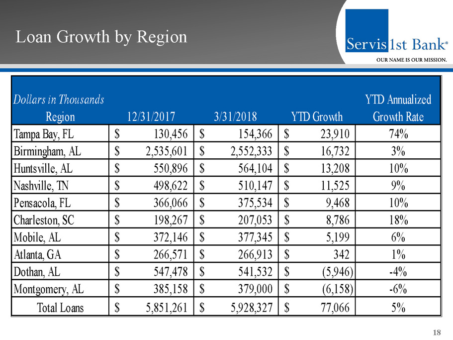 Loan Growth by Region 18 12/31/2017 3/31/2018 YTD Growth YTD Annualized Growth Rate 130,456$ 154,366$ 23,910$ 74% 2,535,601$ 2,552,333$ 16,732$ 3% 550,896$ 564,104$ 13,208$ 10% 498,622$ 510,147$ 11,525$ 9% 366,066$ 375,534$ 9,468$ 10% 198,267$ 207,053$ 8,786$ 18% 372,146$ 377,345$ 5,199$ 6% 266,571$ 266,913$ 342$ 1% 547,478$ 541,532$ (5,946)$ -4% 385,158$ 379,000$ (6,158)$ -6% 5,851,261$ 5,928,327$ 77,066$ 5% Dollars in Thousands Region Total Loans Mobile, AL Atlanta, GA Charleston, SC Dothan, AL Tampa Bay, FL Huntsville, AL Pensacola, FL Montgomery, AL Birmingham, AL Nashville, TN