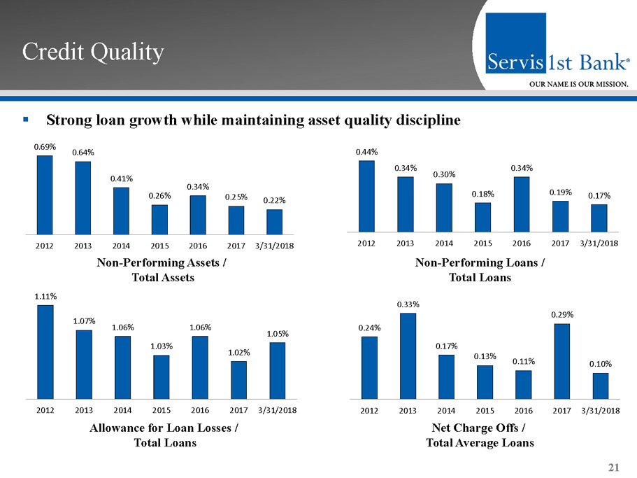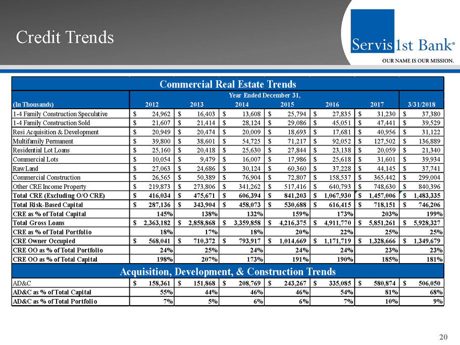 Credit Trends 20 (In Thousands) 2012 2013 2014 2015 2016 2017 3/31/2018 1-4 Family Construction Speculative 24,962$ 16,403$ 13,608$ 25,794$ 27,835$ 31,230$ 37,380$ 1-4 Family Construction Sold 21,607$ 21,414$ 28,124$ 29,086$ 45,051$ 47,441$ 39,529$ Resi Acquisition & Development 20,949$ 20,474$ 20,009$ 18,693$ 17,681$ 40,956$ 31,122$ Multifamily Permanent 39,800$ 38,601$ 54,725$ 71,217$ 92,052$ 127,502$ 136,889$ Residential Lot Loans 25,160$ 20,418$ 25,630$ 27,844$ 23,138$ 20,059$ 21,340$ Commercial Lots 10,054$ 9,479$ 16,007$ 17,986$ 25,618$ 31,601$ 39,934$ Raw Land 27,063$ 24,686$ 30,124$ 60,360$ 37,228$ 44,145$ 37,741$ Commercial Construction 26,565$ 50,389$ 76,904$ 72,807$ 158,537$ 365,442$ 299,004$ Other CRE Income Property 219,873$ 273,806$ 341,262$ 517,416$ 640,793$ 748,630$ 840,396$ Total CRE (Excluding O/O CRE) 416,034$ 475,671$ 606,394$ 841,203$ 1,067,930$ 1,457,006$ 1,483,335$ Total Risk-Based Capital 287,136$ 343,904$ 458,073$ 530,688$ 616,415$ 718,151$ 746,206$ CRE as % of Total Capital 145% 138% 132% 159% 173% 203% 199% Total Gross Loans 2,363,182$ 2,858,868$ 3,359,858$ 4,216,375$ 4,911,770$ 5,851,261$ 5,928,327$ CRE as % of Total Portfolio 18% 17% 18% 20% 22% 25% 25% CRE Owner Occupied 568,041$ 710,372$ 793,917$ 1,014,669$ 1,171,719$ 1,328,666$ 1,349,679$ CRE OO as % of Total Portfolio 24% 25% 24% 24% 24% 23% 23% CRE OO as % of Total Capital 198% 207% 173% 191% 190% 185% 181% AD&C 158,361$ 151,868$ 208,769$ 243,267$ 335,085$ 580,874$ 506,050$ AD&C as % of Total Capital 55% 44% 46% 46% 54% 81% 68% AD&C as % of Total Portfolio 7% 5% 6% 6% 7% 10% 9% Year Ended December 31, Commercial Real Estate Trends Acquisition, Development, & Construction Trends
