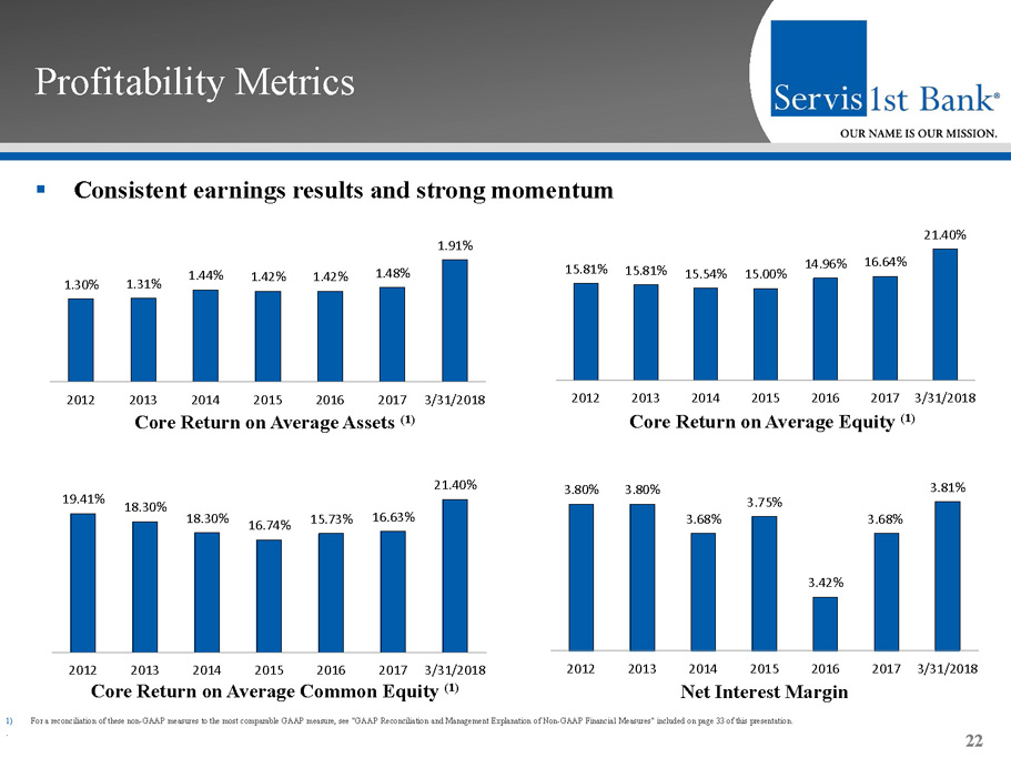 ▪ Strong loan growth while maintaining asset quality discipline Credit Quality 21 Allowance for Loan Losses / Total Loans Net Charge Offs / Total Average Loans Non - Performing Assets / Total Assets Non - Performing Loans / Total Loans 0.69% 0.64% 0.41% 0.26% 0.34% 0.25% 0.22% 2012 2013 2014 2015 2016 2017 3/31/2018 0.44% 0.34% 0.30% 0.18% 0.34% 0.19% 0.17% 2012 2013 2014 2015 2016 2017 3/31/2018 0.24% 0.33% 0.17% 0.13% 0.11% 0.29% 0.10% 2012 2013 2014 2015 2016 2017 3/31/2018 1.11% 1.07% 1.06% 1.03% 1.06% 1.02% 1.05% 2012 2013 2014 2015 2016 2017 3/31/2018