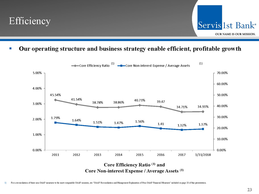 ▪ Consistent earnings results and strong momentum Profitability Metrics 22 Core Return on Average Assets (1) Core Return on Average Equity (1) Core Return on Average Common Equity (1) Net Interest Margin 1) For a reconciliation of these non - GAAP measures to the most comparable GAAP measure, see "GAAP Reconciliation and Management Exp lanation of Non - GAAP Financial Measures" included on page 33 of this presentation. . 1.30% 1.31% 1.44% 1.42% 1.42% 1.48% 1.91% 2012 2013 2014 2015 2016 2017 3/31/2018 19.41% 18.30% 18.30% 16.74% 15.73% 16.63% 21.40% 2012 2013 2014 2015 2016 2017 3/31/2018 3.80% 3.80% 3.68% 3.75% 3.42% 3.68% 3.81% 2012 2013 2014 2015 2016 2017 3/31/2018 15.81% 15.81% 15.54% 15.00% 14.96% 16.64% 21.40% 2012 2013 2014 2015 2016 2017 3/31/2018