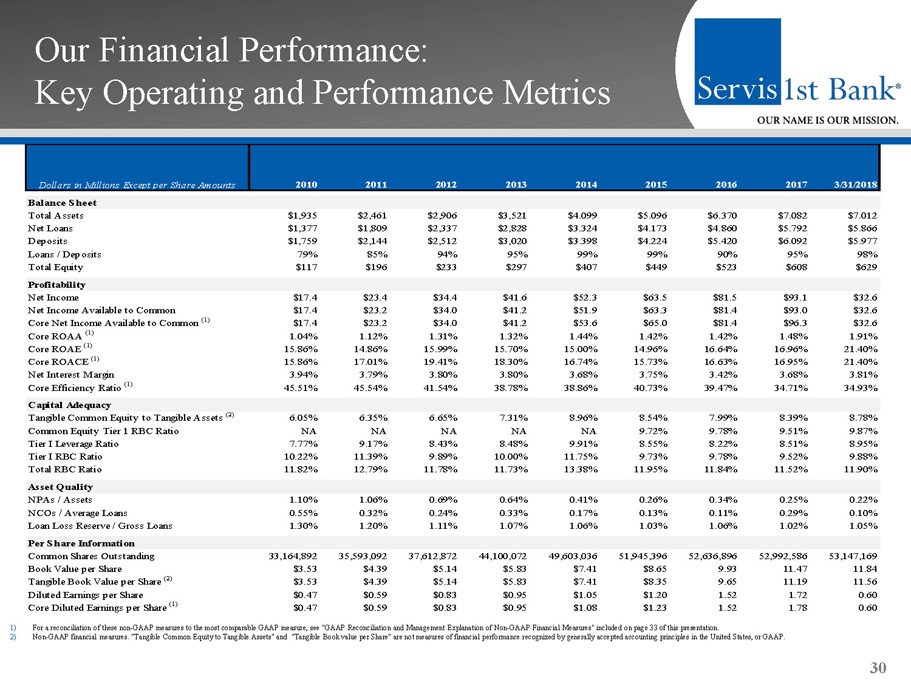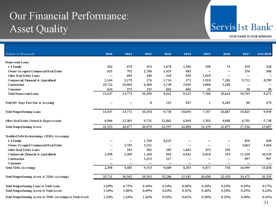 Our Financial Performance: Key Operating and Performance Metrics 30 2010 2011 2012 2013 2014 2015 2016 2017 3/31/2018 Balance Sheet Total Assets $1,935 $2,461 $2,906 $3,521 $4.099 $5.096 $6.370 $7.082 $7.012 Net Loans $1,377 $1,809 $2,337 $2,828 $3.324 $4.173 $4.860 $5.792 $5.866 Deposits $1,759 $2,144 $2,512 $3,020 $3.398 $4.224 $5.420 $6.092 $5.977 Loans / Deposits 79% 85% 94% 95% 99% 99% 90% 95% 98% Total Equity $117 $196 $233 $297 $407 $449 $523 $608 $629 Profitability Net Income $17.4 $23.4 $34.4 $41.6 $52.3 $63.5 $81.5 $93.1 $32.6 Net Income Available to Common $17.4 $23.2 $34.0 $41.2 $51.9 $63.3 $81.4 $93.0 $32.6 Core Net Income Available to Common (1) $17.4 $23.2 $34.0 $41.2 $53.6 $65.0 $81.4 $96.3 $32.6 Core ROAA (1) 1.04% 1.12% 1.31% 1.32% 1.44% 1.42% 1.42% 1.48% 1.91% Core ROAE (1) 15.86% 14.86% 15.99% 15.70% 15.00% 14.96% 16.64% 16.96% 21.40% Core ROACE (1) 15.86% 17.01% 19.41% 18.30% 16.74% 15.73% 16.63% 16.95% 21.40% Net Interest Margin 3.94% 3.79% 3.80% 3.80% 3.68% 3.75% 3.42% 3.68% 3.81% Core Efficiency Ratio (1) 45.51% 45.54% 41.54% 38.78% 38.86% 40.73% 39.47% 34.71% 34.93% Capital Adequacy Tangible Common Equity to Tangible Assets (2) 6.05% 6.35% 6.65% 7.31% 8.96% 8.54% 7.99% 8.39% 8.78% Common Equity Tier 1 RBC Ratio NA NA NA NA NA 9.72% 9.78% 9.51% 9.87% Tier I Leverage Ratio 7.77% 9.17% 8.43% 8.48% 9.91% 8.55% 8.22% 8.51% 8.95% Tier I RBC Ratio 10.22% 11.39% 9.89% 10.00% 11.75% 9.73% 9.78% 9.52% 9.88% Total RBC Ratio 11.82% 12.79% 11.78% 11.73% 13.38% 11.95% 11.84% 11.52% 11.90% Asset Quality NPAs / Assets 1.10% 1.06% 0.69% 0.64% 0.41% 0.26% 0.34% 0.25% 0.22% NCOs / Average Loans 0.55% 0.32% 0.24% 0.33% 0.17% 0.13% 0.11% 0.29% 0.10% Loan Loss Reserve / Gross Loans 1.30% 1.20% 1.11% 1.07% 1.06% 1.03% 1.06% 1.02% 1.05% Per Share Information Common Shares Outstanding 33,164,892 35,593,092 37,612,872 44,100,072 49,603,036 51,945,396 52,636,896 52,992,586 53,147,169 Book Value per Share $3.53 $4.39 $5.14 $5.83 $7.41 $8.65 9.93 11.47 11.84 Tangible Book Value per Share (2) $3.53 $4.39 $5.14 $5.83 $7.41 $8.35 9.65 11.19 11.56 Diluted Earnings per Share $0.47 $0.59 $0.83 $0.95 $1.05 $1.20 1.52 1.72 0.60 Core Diluted Earnings per Share (1) $0.47 $0.59 $0.83 $0.95 $1.08 $1.23 1.52 1.78 0.60 Dollars in Millions Except per Share Amounts 1) For a reconciliation of these non - GAAP measures to the most comparable GAAP measure, see "GAAP Reconciliation and Management Exp lanation of Non - GAAP Financial Measures" included on page 33 of this presentation. 2) Non - GAAP financial measures. "Tangible Common Equity to Tangible Assets" and "Tangible Book value per Share" are not measures o f financial performance recognized by generally accepted accounting principles in the United States, or GAAP.