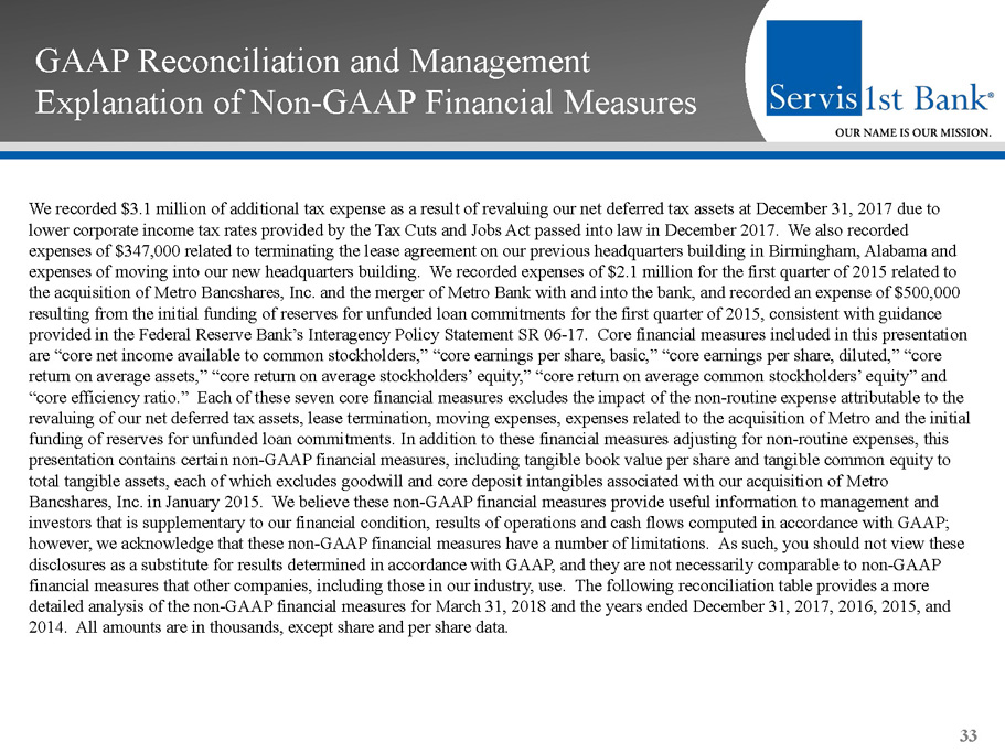 GAAP Reconciliation and Management Explanation of Non - GAAP Financial Measures 33 We recorded $3.1 million of additional tax expense as a result of revaluing our net deferred tax assets at December 31, 2017 due to lower corporate income tax rates provided by the Tax Cuts and Jobs Act passed into law in December 2017. We also recorded expenses of $347,000 related to terminating the lease agreement on our previous headquarters building in Birmingham, Alabama and expenses of moving into our new headquarters building. We recorded expenses of $2.1 million for the first quarter of 2015 re lat ed to the acquisition of Metro Bancshares, Inc. and the merger of Metro Bank with and into the bank, and recorded an expense of $50 0,0 00 resulting from the initial funding of reserves for unfunded loan commitments for the first quarter of 2015, consistent with g uid ance provided in the Federal Reserve Bank’s Interagency Policy Statement SR 06 - 17. Core financial measures included in this presenta tion are “core net income available to common stockholders,” “core earnings per share, basic,” “core earnings per share, diluted,” “c ore return on average assets,” “core return on average stockholders’ equity,” “core return on average common stockholders’ equity ” a nd “core efficiency ratio.” Each of these seven core financial measures excludes the impact of the non - routine expense attributabl e to the revaluing of our net deferred tax assets, lease termination, moving expenses, expenses related to the acquisition of Metro an d t he initial funding of reserves for unfunded loan commitments. In addition to these financial measures adjusting for non - routine expenses, t his presentation contains certain non - GAAP financial measures, including tangible book value per share and tangible common equity to total tangible assets, each of which excludes goodwill and core deposit intangibles associated with our acquisition of Metro Bancshares, Inc. in January 2015. We believe these non - GAAP financial measures provide useful information to management and investors that is supplementary to our financial condition, results of operations and cash flows computed in accordance with GAA P; however, we acknowledge that these non - GAAP financial measures have a number of limitations. As such, you should not view these disclosures as a substitute for results determined in accordance with GAAP, and they are not necessarily comparable to non - GAAP financial measures that other companies, including those in our industry, use. The following reconciliation table provides a mo re detailed analysis of the non - GAAP financial measures for March 31, 2018 and the years ended December 31, 2017, 2016, 2015, and 2014. All amounts are in thousands, except share and per share data.