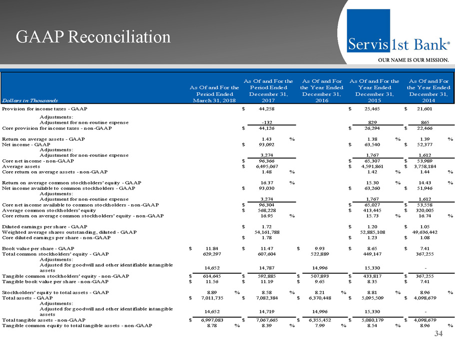 GAAP Reconciliation 34 Dollars in Thousands $ 44,258 $ 25,465 $ 21,601 Adjustments: Adjustment for non-routine expense -132 829 865 $ 44,126 $ 26,294 $ 22,466 1.43 % 1.38 % 1.39 % $ 93,092 $ 63,540 $ 52,377 Adjustments: Adjustment for non-routine expense 3,274 1,767 1,612 $ 96,366 $ 65,307 $ 53,989 $ 6,495,067 $ 4,591,861 $ 3,758,184 1.48 % 1.42 % 1.44 % 16.37 % 15.30 % 14.43 % $ 93,030 $ 63,260 $ 51,946 Adjustments: Adjustment for non-routine expense 3,274 1,767 1,612 $ 96,304 $ 65,027 $ 53,558 $ 568,228 $ 413,445 $ 320,005 16.95 % 15.73 % 16.74 % $ 1.72 $ 1.20 $ 1.05 54,161,788 52,885,108 49,636,442 $ 1.78 $ 1.23 $ 1.08 $ 11.84 $ 11.47 $ 9.93 $ 8.65 $ 7.41 629,297 607,604 522,889 449,147 367,255 Adjustments: Adjusted for goodwill and other identifiable intangible assets 14,652 14,787 14,996 15,330 - $ 614,645 $ 592,885 $ 507,893 $ 433,817 $ 367,255 $ 11.56 $ 11.19 $ 9.65 $ 8.35 $ 7.41 8.89 % 8.58 % 8.21 % 8.81 % 8.96 % $ 7,011,735 $ 7,082,384 $ 6,370,448 $ 5,095,509 $ 4,098,679 Adjustments: Adjusted for goodwill and other identifiable intangible assets 14,652 14,719 14,996 15,330 - $ 6,997,083 $ 7,067,665 $ 6,355,452 $ 5,080,179 $ 4,098,679 8.78 % 8.39 % 7.99 % 8.54 % 8.96 % Average common stockholders' equity Core return on average common stockholders' equity - non-GAAP Tangible book value per share - non-GAAP As Of and For the Year Ended December 31, 2014 Book value per share - GAAP As Of and For the Year Ended December 31, 2015 Provision for income taxes - GAAP Return on average assets - GAAP Core net income - non-GAAP As Of and For the Year Ended December 31, 2016 As Of and For the Period Ended December 31, 2017 As Of and For the Period Ended March 31, 2018 Stockholders' equity to total assets - GAAP Total assets - GAAP Total tangible assets - non-GAAP Tangible common equity to total tangible assets - non-GAAP Core provision for income taxes - non-GAAP Net income - GAAP Core diluted earnings per share - non-GAAP Total common stockholders' equity - GAAP Tangible common stockholders' equity - non-GAAP Average assets Core return on average assets - non-GAAP Return on average common stockholders' equity - GAAP Net income available to common stockholders - GAAP Diluted earnings per share - GAAP Weighted average shares outstanding, diluted - GAAP Core net income available to common stockholders - non-GAAP