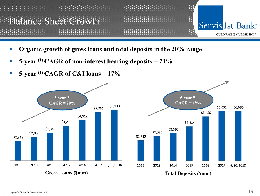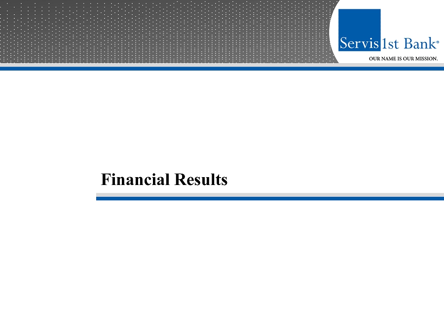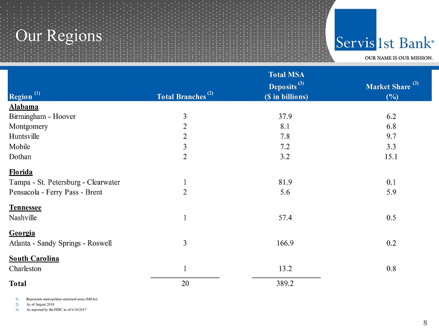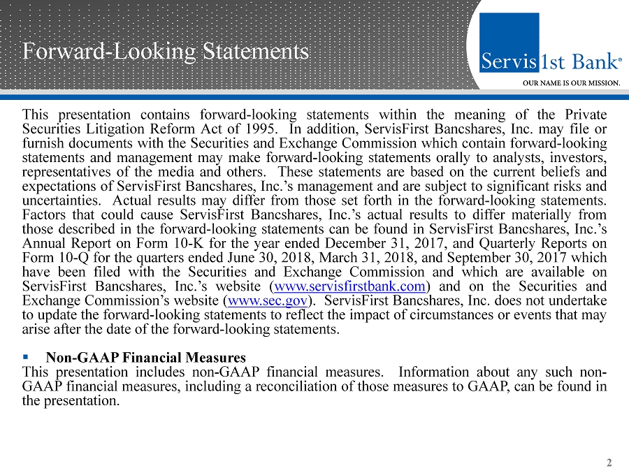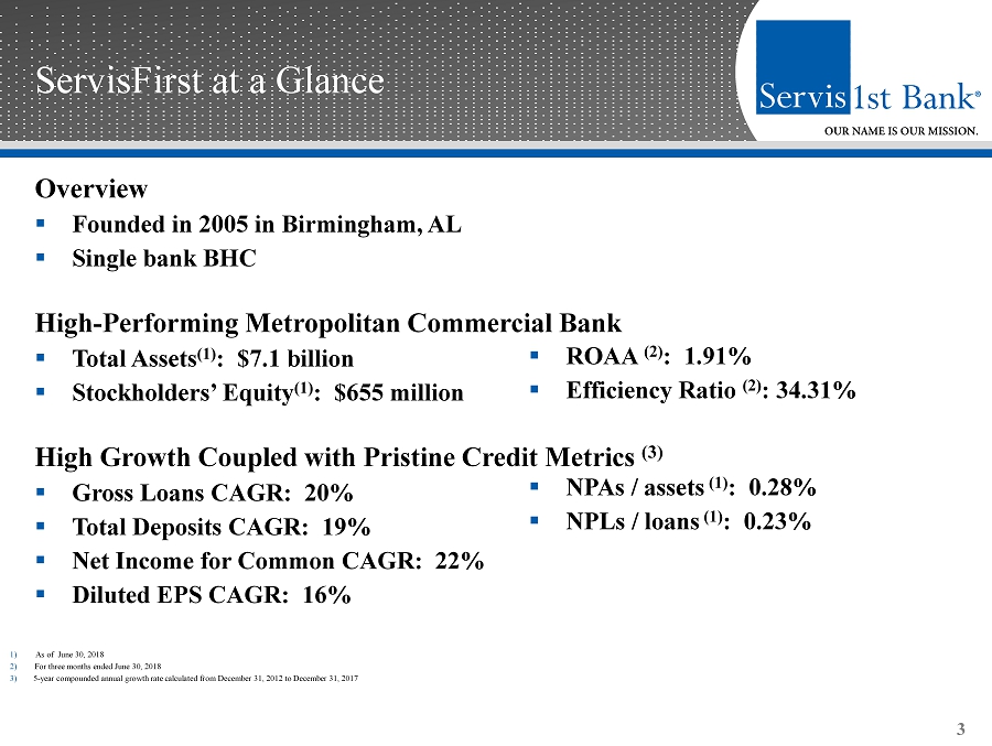 Forward - Looking Statements This presentation contains forward - looking statements within the meaning of the Private Securities Litigation Reform Act of 1995 . In addition, ServisFirst Bancshares, Inc . may file or furnish documents with the Securities and Exchange Commission which contain forward - looking statements and management may make forward - looking statements orally to analysts, investors, representatives of the media and others . These statements are based on the current beliefs and expectations of ServisFirst Bancshares, Inc . ’s management and are subject to significant risks and uncertainties . Actual results may differ from those set forth in the forward - looking statements . Factors that could cause ServisFirst Bancshares, Inc . ’s actual results to differ materially from those described in the forward - looking statements can be found in ServisFirst Bancshares, Inc . ’s Annual Report on Form 10 - K for the year ended December 31 , 2017 , and Quarterly Reports on Form 10 - Q for the quarters ended June 30 , 2018 , March 31 , 2018 , and September 30 , 2017 which have been filed with the Securities and Exchange Commission and which are available on ServisFirst Bancshares, Inc . ’s website ( www . servisfirstbank . com ) and on the Securities and Exchange Commission’s website ( www . sec . gov ) . ServisFirst Bancshares, Inc . does not undertake to update the forward - looking statements to reflect the impact of circumstances or events that may arise after the date of the forward - looking statements . ▪ Non - GAAP Financial Measures This presentation includes non - GAAP financial measures . Information about any such non - GAAP financial measures, including a reconciliation of those measures to GAAP, can be found in the presentation . 2