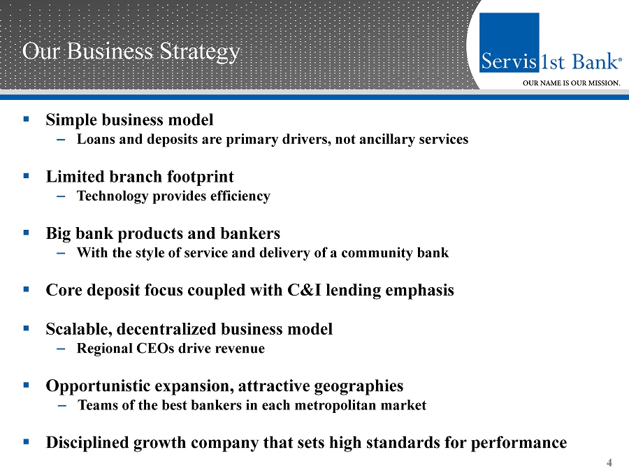 ServisFirst at a Glance Overview ▪ Founded in 2005 in Birmingham, AL ▪ Single bank BHC High - Performing Metropolitan Commercial Bank ▪ Total Assets (1) : $7.1 billion ▪ Stockholders’ Equity (1) : $655 million High Growth Coupled with Pristine Credit Metrics (3) ▪ Gross Loans CAGR: 20% ▪ Total Deposits CAGR: 19% ▪ Net Income for Common CAGR: 22% ▪ Diluted EPS CAGR: 16% 3 ▪ ROAA (2) : 1.91% ▪ Efficiency Ratio (2) : 34.31% 1) As of June 30, 2018 2) For three months ended June 30, 2018 3) 5 - year compounded annual growth rate calculated from December 31, 2012 to December 31, 2017 ▪ NPAs / assets (1) : 0.28% ▪ NPLs / loans (1) : 0.23%