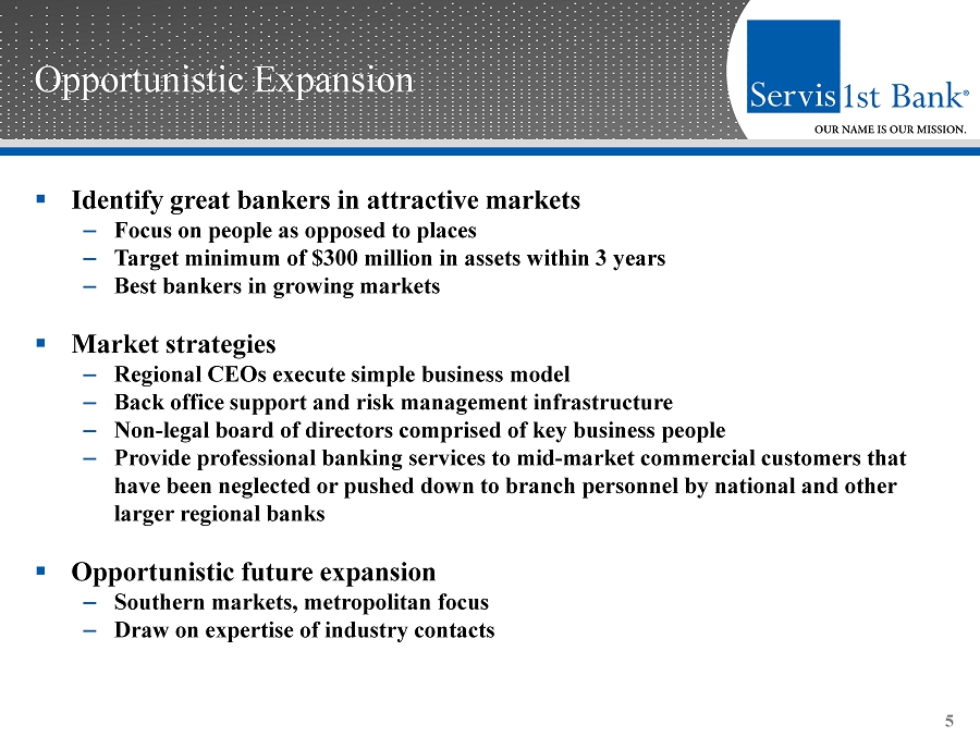 Our Business Strategy ▪ Simple business model – Loans and deposits are primary drivers, not ancillary services ▪ Limited branch footprint – Technology provides efficiency ▪ Big bank products and bankers – With the style of service and delivery of a community bank ▪ Core deposit focus coupled with C&I lending emphasis ▪ Scalable, decentralized business model – Regional CEOs drive revenue ▪ Opportunistic expansion, attractive geographies – Teams of the best bankers in each metropolitan market ▪ Disciplined growth company that sets high standards for performance 4