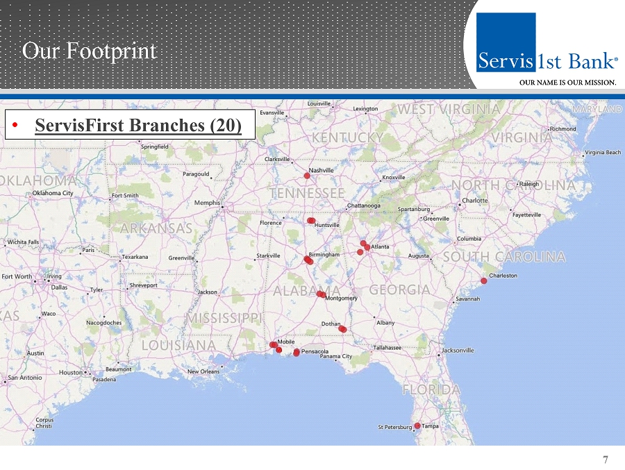 Milestones 6 ▪ Founded in May 2005 with initial capital raise of $35 million ▪ Reached profitability during the fourth quarter of 2005 and have been profitable every quarter since ▪ Achieved total asset milestones of $1 billion in 2008, $2 billion in 2011, $3 billion in 2013, $4 billion in 2014, $5 billion in 2015, $6 billion in 2016, and $7 billion in 2017 2014 May ’05: Founded in Birmingham, AL June ’07: Montgomery, AL March ’11: Correspondent Banking April ’13: Mobile, AL May ’14: NASDAQ listed August ’06: Huntsville, AL September ’08: Dothan, AL April ’11: Pensacola, FL April ’13: Nashville, TN February ‘15: Metro Bank Acquisition January ’15: Charleston, SC 2015 2012 2013 2011 2010 2009 2008 2007 2006 2005 January ’16: Tampa Bay, FL 2017 2016 2018