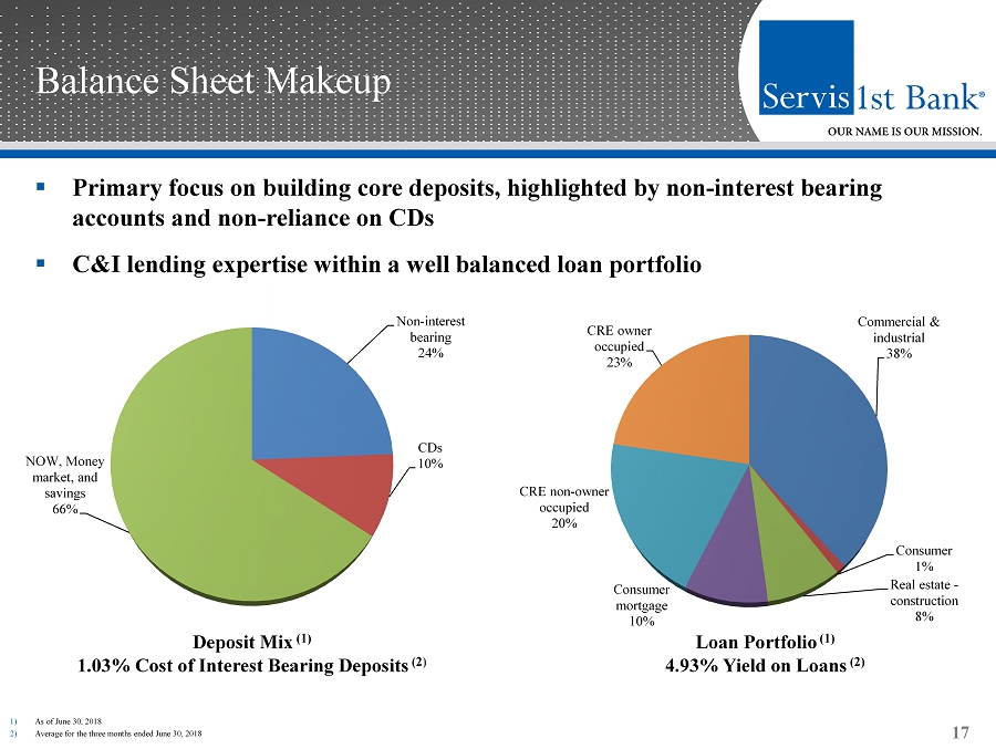 ▪ Rare combination of balance sheet growth and earnings power ▪ EPS growth includes impact of $55.1 million of common stock issued in five private placements as we entered new markets and $56.9 from the initial public offering Income Growth 16 5 - year (1) CAGR = 22% 5 - year (1) CAGR = 16% Net Income Available to Common Stockholders ($mm) Diluted Earnings Per Common Share $34.0 $41.2 $51.9 $63.3 $81.4 $93.0 $66.1 2012 2013 2014 2015 2016 2017 6/30/2018 0.83 0.95 1.05 1.20 1.52 1.72 1.22 2012 2013 2014 2015 2016 2017 6/30/2018 1) 5 – year CAGR = 12/31/2012 – 12/31/2017