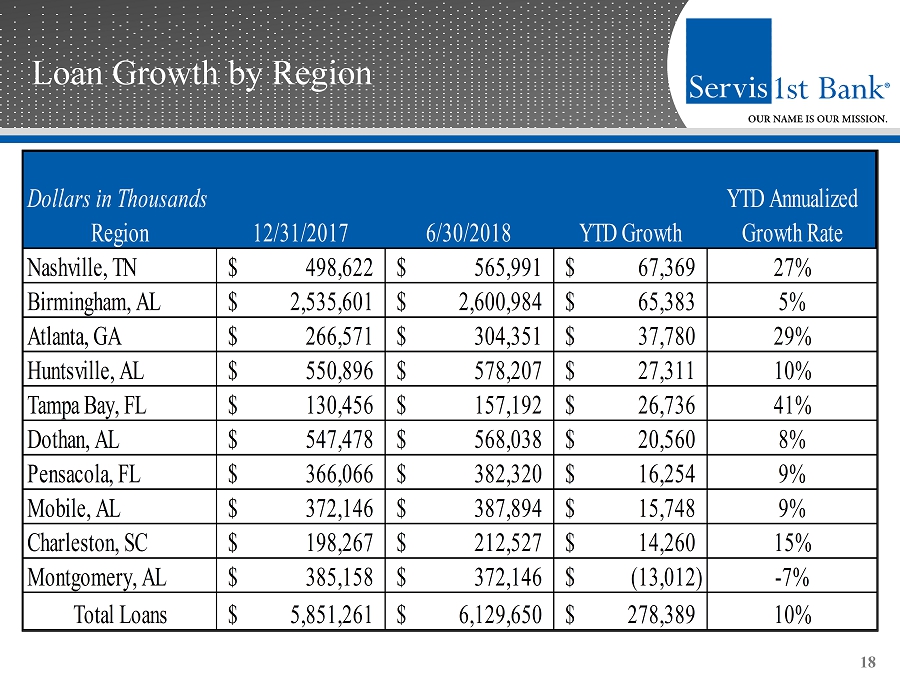 Loan Growth by Region 18 12/31/2017 6/30/2018 YTD Growth YTD Annualized Growth Rate 498,622$ 565,991$ 67,369$ 27% 2,535,601$ 2,600,984$ 65,383$ 5% 266,571$ 304,351$ 37,780$ 29% 550,896$ 578,207$ 27,311$ 10% 130,456$ 157,192$ 26,736$ 41% 547,478$ 568,038$ 20,560$ 8% 366,066$ 382,320$ 16,254$ 9% 372,146$ 387,894$ 15,748$ 9% 198,267$ 212,527$ 14,260$ 15% 385,158$ 372,146$ (13,012)$ -7% 5,851,261$ 6,129,650$ 278,389$ 10% Dollars in Thousands Region Total Loans Mobile, AL Atlanta, GA Charleston, SC Dothan, AL Tampa Bay, FL Huntsville, AL Pensacola, FL Montgomery, AL Birmingham, AL Nashville, TN