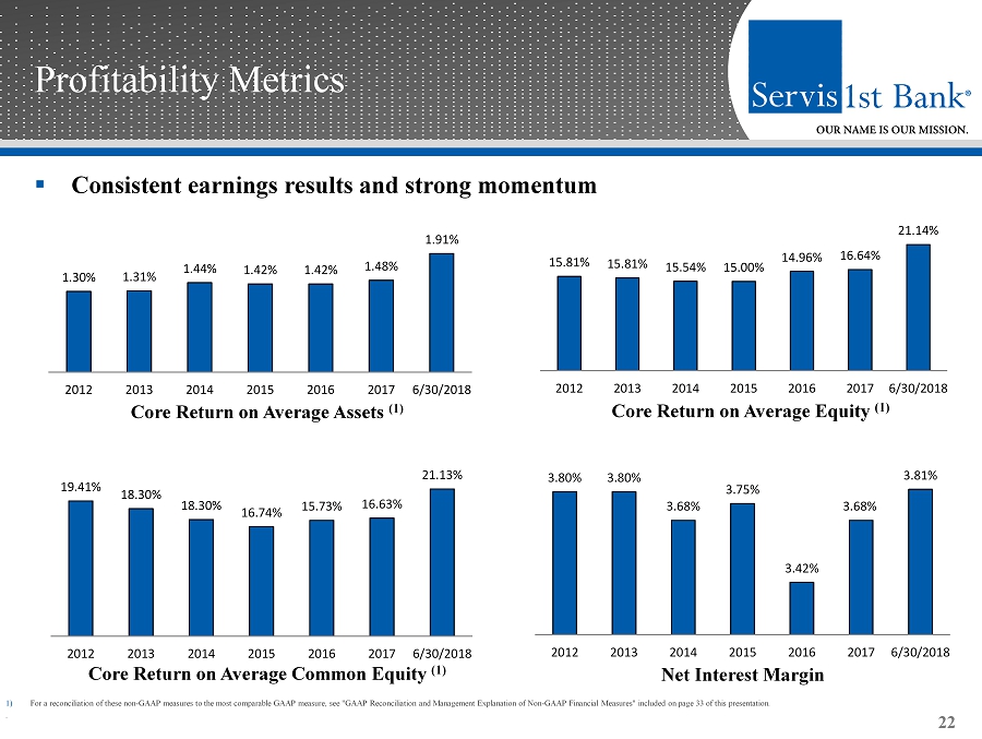 ▪ Strong loan growth while maintaining asset quality discipline Credit Quality 21 Allowance for Loan Losses / Total Loans Net Charge Offs / Total Average Loans Non - Performing Assets / Total Assets Non - Performing Loans / Total Loans 0.69% 0.64% 0.41% 0.26% 0.34% 0.25% 0.28% 2012 2013 2014 2015 2016 2017 6/30/2018 0.44% 0.34% 0.30% 0.18% 0.34% 0.19% 0.23% 2012 2013 2014 2015 2016 2017 6/30/2018 0.24% 0.33% 0.17% 0.13% 0.11% 0.29% 0.12% 2012 2013 2014 2015 2016 2017 6/30/2018 1.11% 1.07% 1.06% 1.03% 1.06% 1.02% 1.05% 2012 2013 2014 2015 2016 2017 6/30/2018
