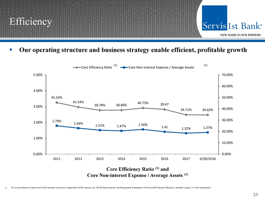 ▪ Consistent earnings results and strong momentum Profitability Metrics 22 Core Return on Average Assets (1) Core Return on Average Equity (1) Core Return on Average Common Equity (1) Net Interest Margin 1) For a reconciliation of these non - GAAP measures to the most comparable GAAP measure, see "GAAP Reconciliation and Management Exp lanation of Non - GAAP Financial Measures" included on page 33 of this presentation. . 1.30% 1.31% 1.44% 1.42% 1.42% 1.48% 1.91% 2012 2013 2014 2015 2016 2017 6/30/2018 19.41% 18.30% 18.30% 16.74% 15.73% 16.63% 21.13% 2012 2013 2014 2015 2016 2017 6/30/2018 3.80% 3.80% 3.68% 3.75% 3.42% 3.68% 3.81% 2012 2013 2014 2015 2016 2017 6/30/2018 15.81% 15.81% 15.54% 15.00% 14.96% 16.64% 21.14% 2012 2013 2014 2015 2016 2017 6/30/2018