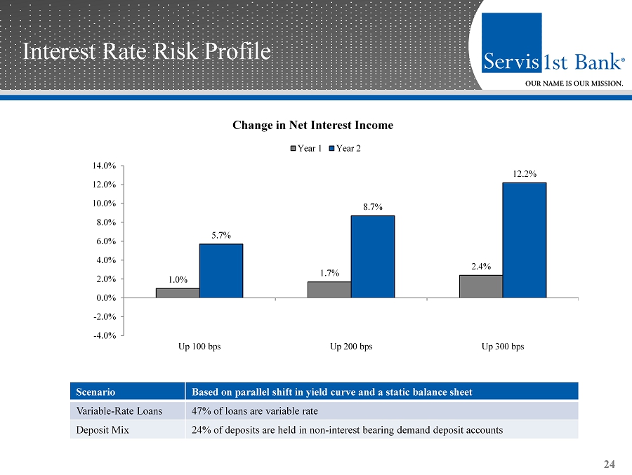 ▪ Our operating structure and business strategy enable efficient, profitable growth Efficiency 23 Core Efficiency Ratio (1) and Core Non - interest Expense / Average Assets (1) (1) (1) 45.54% 41.54% 38.78% 38.86% 40.73% 39.47 34.71% 34.62% 1.79% 1.64% 1.51% 1.47% 1.56% 1.41 1.32% 1.37% 0.00% 1.00% 2.00% 3.00% 4.00% 5.00% 2011 2012 2013 2014 2015 2016 2017 6/30/2018 0.00% 10.00% 20.00% 30.00% 40.00% 50.00% 60.00% 70.00% Core Efficiency Ratio Core Non-interest Expense / Average Assets 1) For a reconciliation of these non - GAAP measures to the most comparable GAAP measure, see "GAAP Reconciliation and Management Explanation of Non - GAAP Financial Measures" included on page 33 of this presentation .