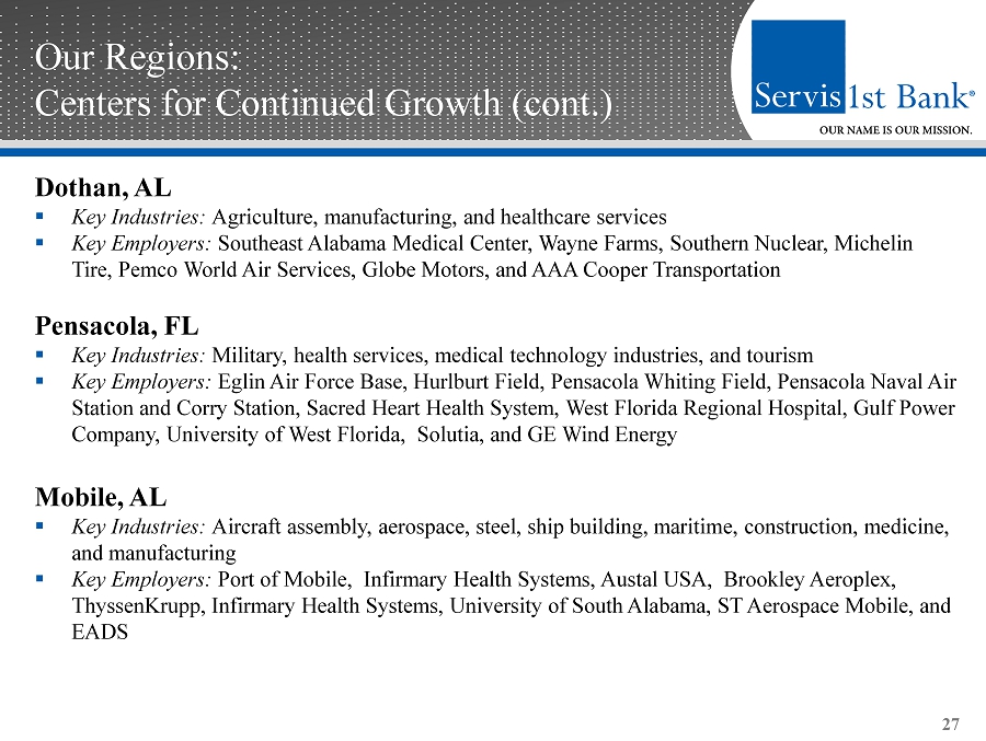Our Regions: Centers for Continued Growth Birmingham, AL ▪ Key Industries: Metals manufacturing, finance, insurance, healthcare services and distribution ▪ Key Employers: Protective Life, HealthSouth Corporation, Vulcan Materials Company, AT&T, and University of Alabama at Birmingham Huntsville, AL ▪ Key Industries: U.S. government, aerospace/defense, commercial and university research ▪ Key Employers: U.S. Army/Redstone Arsenal, Boeing Company, NASA/Marshall Space Flight Center, Intergraph Corporation, ADTRAN, Northrop Grumman, Cinram, SAIC, DirecTV, Lockheed Martin, and Toyota Motor Manufacturing Montgomery, AL ▪ Key Industries : U.S. and state government, U.S. Air Force , automotive manufacturing ▪ Key Employers: Maxwell Gunter Air Force Base, State of Alabama, Baptist Health Systems, Hyundai Motor Manufacturing, and MOBIS Alabama 26