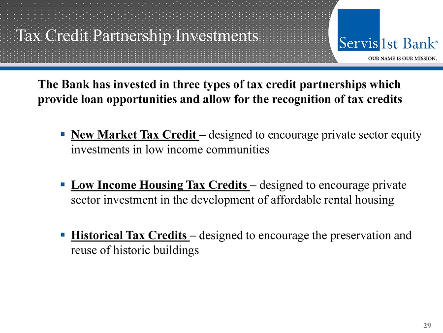 Tax Credit Partnership Investments The Bank has invested in three types of tax credit partnerships which provide loan opportunities and allow for the recognition of tax credits ▪ New Market Tax Credit – designed to encourage private sector equity investments in low income communities ▪ Low Income Housing Tax Credits – designed to encourage private sector investment in the development of affordable rental housing ▪ Historical Tax Credits – designed to encourage the preservation and reuse of historic buildings 29