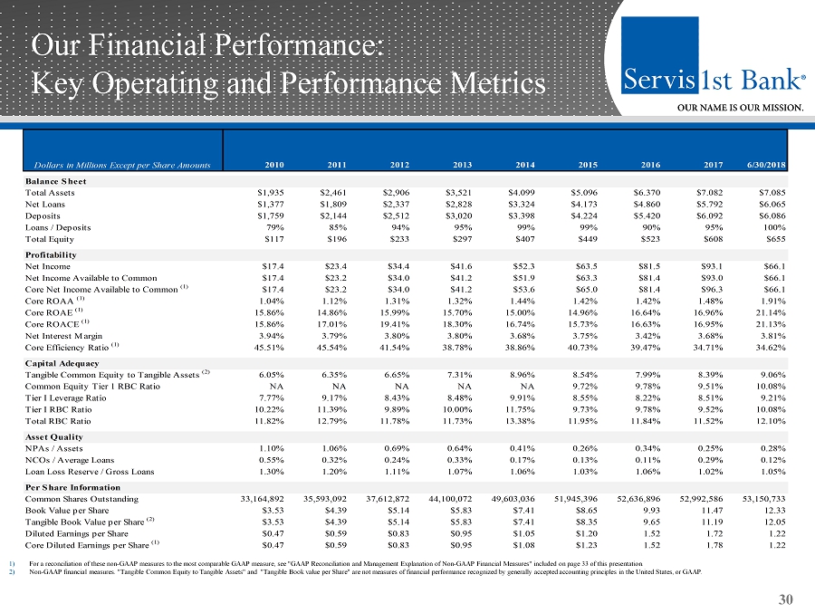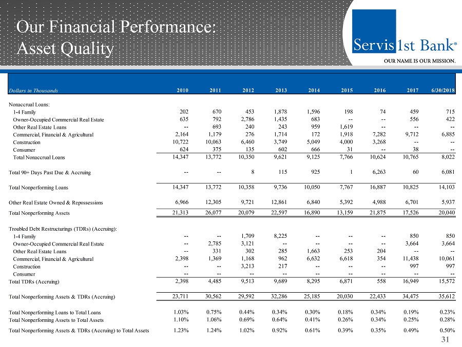 Our Financial Performance: Key Operating and Performance Metrics 30 2010 2011 2012 2013 2014 2015 2016 2017 6/30/2018 Balance Sheet Total Assets $1,935 $2,461 $2,906 $3,521 $4.099 $5.096 $6.370 $7.082 $7.085 Net Loans $1,377 $1,809 $2,337 $2,828 $3.324 $4.173 $4.860 $5.792 $6.065 Deposits $1,759 $2,144 $2,512 $3,020 $3.398 $4.224 $5.420 $6.092 $6.086 Loans / Deposits 79% 85% 94% 95% 99% 99% 90% 95% 100% Total Equity $117 $196 $233 $297 $407 $449 $523 $608 $655 Profitability Net Income $17.4 $23.4 $34.4 $41.6 $52.3 $63.5 $81.5 $93.1 $66.1 Net Income Available to Common $17.4 $23.2 $34.0 $41.2 $51.9 $63.3 $81.4 $93.0 $66.1 Core Net Income Available to Common (1) $17.4 $23.2 $34.0 $41.2 $53.6 $65.0 $81.4 $96.3 $66.1 Core ROAA (1) 1.04% 1.12% 1.31% 1.32% 1.44% 1.42% 1.42% 1.48% 1.91% Core ROAE (1) 15.86% 14.86% 15.99% 15.70% 15.00% 14.96% 16.64% 16.96% 21.14% Core ROACE (1) 15.86% 17.01% 19.41% 18.30% 16.74% 15.73% 16.63% 16.95% 21.13% Net Interest Margin 3.94% 3.79% 3.80% 3.80% 3.68% 3.75% 3.42% 3.68% 3.81% Core Efficiency Ratio (1) 45.51% 45.54% 41.54% 38.78% 38.86% 40.73% 39.47% 34.71% 34.62% Capital Adequacy Tangible Common Equity to Tangible Assets (2) 6.05% 6.35% 6.65% 7.31% 8.96% 8.54% 7.99% 8.39% 9.06% Common Equity Tier 1 RBC Ratio NA NA NA NA NA 9.72% 9.78% 9.51% 10.08% Tier I Leverage Ratio 7.77% 9.17% 8.43% 8.48% 9.91% 8.55% 8.22% 8.51% 9.21% Tier I RBC Ratio 10.22% 11.39% 9.89% 10.00% 11.75% 9.73% 9.78% 9.52% 10.08% Total RBC Ratio 11.82% 12.79% 11.78% 11.73% 13.38% 11.95% 11.84% 11.52% 12.10% Asset Quality NPAs / Assets 1.10% 1.06% 0.69% 0.64% 0.41% 0.26% 0.34% 0.25% 0.28% NCOs / Average Loans 0.55% 0.32% 0.24% 0.33% 0.17% 0.13% 0.11% 0.29% 0.12% Loan Loss Reserve / Gross Loans 1.30% 1.20% 1.11% 1.07% 1.06% 1.03% 1.06% 1.02% 1.05% Per Share Information Common Shares Outstanding 33,164,892 35,593,092 37,612,872 44,100,072 49,603,036 51,945,396 52,636,896 52,992,586 53,150,733 Book Value per Share $3.53 $4.39 $5.14 $5.83 $7.41 $8.65 9.93 11.47 12.33 Tangible Book Value per Share (2) $3.53 $4.39 $5.14 $5.83 $7.41 $8.35 9.65 11.19 12.05 Diluted Earnings per Share $0.47 $0.59 $0.83 $0.95 $1.05 $1.20 1.52 1.72 1.22 Core Diluted Earnings per Share (1) $0.47 $0.59 $0.83 $0.95 $1.08 $1.23 1.52 1.78 1.22 Dollars in Millions Except per Share Amounts 1) For a reconciliation of these non - GAAP measures to the most comparable GAAP measure, see "GAAP Reconciliation and Management Exp lanation of Non - GAAP Financial Measures" included on page 33 of this presentation. 2) Non - GAAP financial measures. "Tangible Common Equity to Tangible Assets" and "Tangible Book value per Share" are not measures o f financial performance recognized by generally accepted accounting principles in the United States, or GAAP.