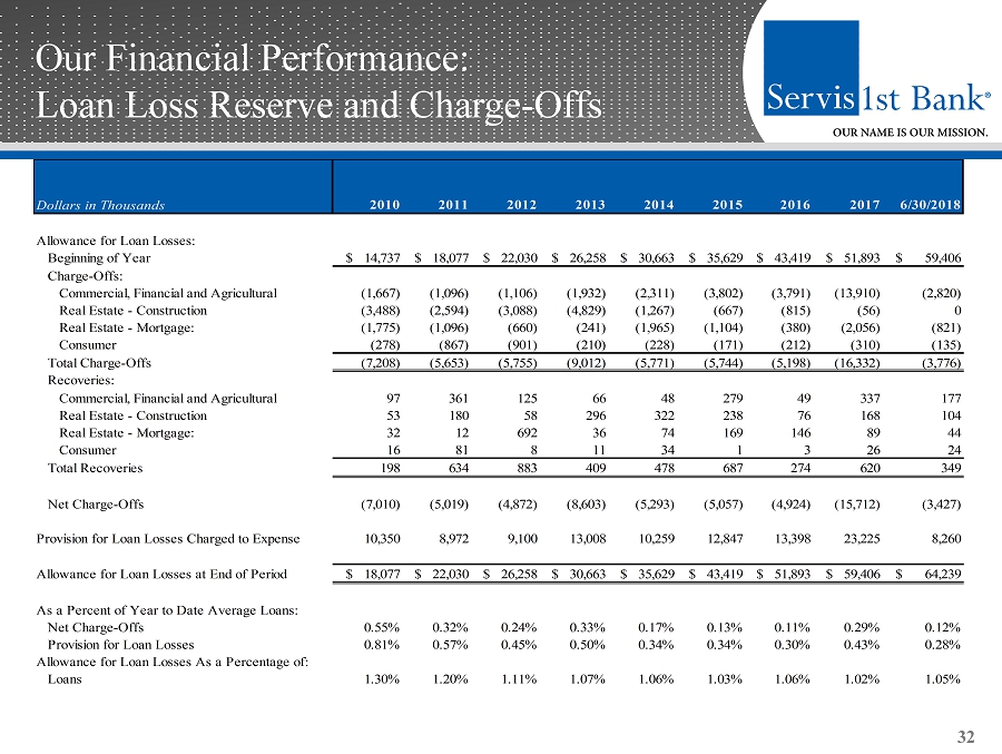 Our Financial Performance: Asset Quality 31 Dollars in Thousands 2010 2011 2012 2013 2014 2015 2016 2017 6/30/2018 Nonaccrual Loans: 1-4 Family 202 670 453 1,878 1,596 198 74 459 715 Owner-Occupied Commercial Real Estate 635 792 2,786 1,435 683 -- -- 556 422 Other Real Estate Loans -- 693 240 243 959 1,619 -- -- -- Commercial, Financial & Agricultural 2,164 1,179 276 1,714 172 1,918 7,282 9,712 6,885 Construction 10,722 10,063 6,460 3,749 5,049 4,000 3,268 -- -- Consumer 624 375 135 602 666 31 -- 38 -- Total Nonaccrual Loans 14,347 13,772 10,350 9,621 9,125 7,766 10,624 10,765 8,022 Total 90+ Days Past Due & Accruing -- -- 8 115 925 1 6,263 60 6,081 Total Nonperforming Loans 14,347 13,772 10,358 9,736 10,050 7,767 16,887 10,825 14,103 Other Real Estate Owned & Repossessions 6,966 12,305 9,721 12,861 6,840 5,392 4,988 6,701 5,937 Total Nonperforming Assets 21,313 26,077 20,079 22,597 16,890 13,159 21,875 17,526 20,040 Troubled Debt Restructurings (TDRs) (Accruing): 1-4 Family -- -- 1,709 8,225 -- -- -- 850 850 Owner-Occupied Commercial Real Estate -- 2,785 3,121 -- -- -- -- 3,664 3,664 Other Real Estate Loans -- 331 302 285 1,663 253 204 -- -- Commercial, Financial & Agricultural 2,398 1,369 1,168 962 6,632 6,618 354 11,438 10,061 Construction -- -- 3,213 217 -- -- -- 997 997 Consumer -- -- -- -- -- -- -- -- -- Total TDRs (Accruing) 2,398 4,485 9,513 9,689 8,295 6,871 558 16,949 15,572 Total Nonperforming Assets & TDRs (Accruing) 23,711 30,562 29,592 32,286 25,185 20,030 22,433 34,475 35,612 Total Nonperforming Loans to Total Loans 1.03% 0.75% 0.44% 0.34% 0.30% 0.18% 0.34% 0.19% 0.23% Total Nonperforming Assets to Total Assets 1.10% 1.06% 0.69% 0.64% 0.41% 0.26% 0.34% 0.25% 0.28% Total Nonperforming Assets & TDRs (Accruing) to Total Assets 1.23% 1.24% 1.02% 0.92% 0.61% 0.39% 0.35% 0.49% 0.50%