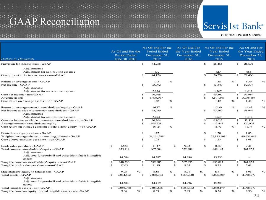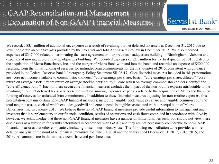 GAAP Reconciliation and Management Explanation of Non - GAAP Financial Measures 33 We recorded $3.1 million of additional tax expense as a result of revaluing our net deferred tax assets at December 31, 2017 due to lower corporate income tax rates provided by the Tax Cuts and Jobs Act passed into law in December 2017. We also recorded expenses of $347,000 related to terminating the lease agreement on our previous headquarters building in Birmingham, Alabama and expenses of moving into our new headquarters building. We recorded expenses of $2.1 million for the first quarter of 2015 re lat ed to the acquisition of Metro Bancshares, Inc. and the merger of Metro Bank with and into the bank, and recorded an expense of $50 0,0 00 resulting from the initial funding of reserves for unfunded loan commitments for the first quarter of 2015, consistent with g uid ance provided in the Federal Reserve Bank’s Interagency Policy Statement SR 06 - 17. Core financial measures included in this presenta tion are “core net income available to common stockholders,” “core earnings per share, basic,” “core earnings per share, diluted,” “c ore return on average assets,” “core return on average stockholders’ equity,” “core return on average common stockholders’ equity ” a nd “core efficiency ratio.” Each of these seven core financial measures excludes the impact of the non - routine expense attributabl e to the revaluing of our net deferred tax assets, lease termination, moving expenses, expenses related to the acquisition of Metro an d t he initial funding of reserves for unfunded loan commitments. In addition to these financial measures adjusting for non - routine expenses, t his presentation contains certain non - GAAP financial measures, including tangible book value per share and tangible common equity to total tangible assets, each of which excludes goodwill and core deposit intangibles associated with our acquisition of Metro Bancshares, Inc. in January 2015. We believe these non - GAAP financial measures provide useful information to management and investors that is supplementary to our financial condition, results of operations and cash flows computed in accordance with GAA P; however, we acknowledge that these non - GAAP financial measures have a number of limitations. As such, you should not view these disclosures as a substitute for results determined in accordance with GAAP, and they are not necessarily comparable to non - GAAP financial measures that other companies, including those in our industry, use. The following reconciliation table provides a mo re detailed analysis of the non - GAAP financial measures for June 30, 2018 and the years ended December 31, 2017, 2016, 2015, and 2014. All amounts are in thousands, except share and per share data.