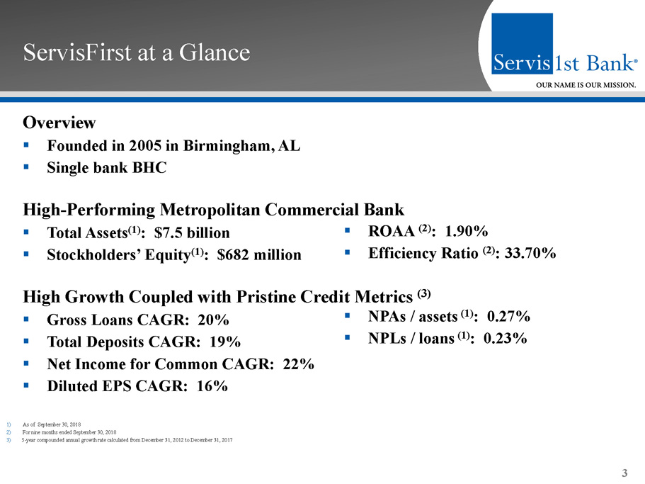 Forward - Looking Statements This presentation contains forward - looking statements within the meaning of the Private Securities Litigation Reform Act of 1995 . In addition, ServisFirst Bancshares, Inc . may file or furnish documents with the Securities and Exchange Commission which contain forward - looking statements and management may make forward - looking statements orally to analysts, investors, representatives of the media and others . These statements are based on the current beliefs and expectations of ServisFirst Bancshares, Inc . ’s management and are subject to significant risks and uncertainties . Actual results may differ from those set forth in the forward - looking statements . Factors that could cause ServisFirst Bancshares, Inc . ’s actual results to differ materially from those described in the forward - looking statements can be found in ServisFirst Bancshares, Inc . ’s Annual Report on Form 10 - K for the year ended December 31 , 2017 , and Quarterly Reports on Form 10 - Q for the quarters ended September 30 , 2018 , June 30 , 2018 , and March 31 , 2018 , which have been filed with the Securities and Exchange Commission and which are available on ServisFirst Bancshares, Inc . ’s website ( www . servisfirstbank . com ) and on the Securities and Exchange Commission’s website ( www . sec . gov ) . ServisFirst Bancshares, Inc . does not undertake to update the forward - looking statements to reflect the impact of circumstances or events that may arise after the date of the forward - looking statements . ▪ Non - GAAP Financial Measures This presentation includes non - GAAP financial measures . Information about any such non - GAAP financial measures, including a reconciliation of those measures to GAAP, can be found in the presentation . 2