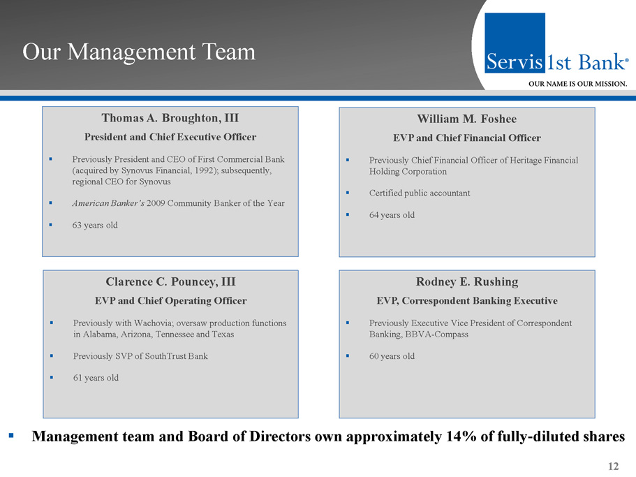 Our Management Team Thomas A. Broughton, III President and Chief Executive Officer ▪ Previously President and CEO of First Commercial Bank (acquired by Synovus Financial, 1992); subsequently, regional CEO for Synovus ▪ American Banker’s 2009 Community Banker of the Year ▪ 63 years old 12 William M. Foshee EVP and Chief Financial Officer ▪ Previously Chief Financial Officer of Heritage Financial Holding Corporation ▪ Certified public accountant ▪ 64 years old Clarence C. Pouncey , III EVP and Chief Operating Officer ▪ Previously with Wachovia; oversaw production functions in Alabama, Arizona, Tennessee and Texas ▪ Previously SVP of SouthTrust Bank ▪ 61 years old Rodney E. Rushing EVP, Correspondent Banking Executive ▪ Previously Executive Vice President of Correspondent Banking, BBVA - Compass ▪ 60 years old ▪ Management team and Board of Directors own approximately 14% of fully - diluted shares