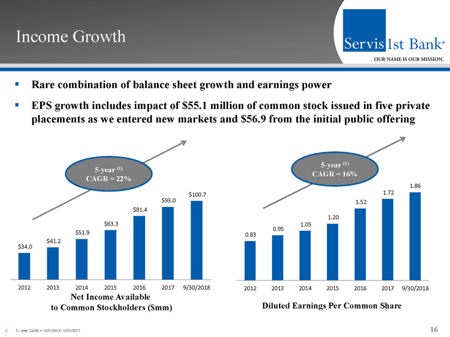 Balance Sheet Growth 15 5 - year (1) CAGR = 20% 5 - year (1) CAGR = 19% Gross Loans ($mm) Total Deposits ($mm) ▪ Organic growth of gross loans and total deposits in the 20% range ▪ 5 - year (1) CAGR of non - interest bearing deposits = 21% ▪ 5 - year (1) CAGR of C&I loans = 17% $2,363 $2,859 $3,360 $4,216 $4,912 $5,851 $6,364 2012 2013 2014 2015 2016 2017 9/30/2018 1) 5 – year CAGR = 12/31/2012 – 12/31/2017 $2,512 $3,020 $3,398 $4,224 $5,420 $6,092 $6,505 2012 2013 2014 2015 2016 2017 9/30/2018