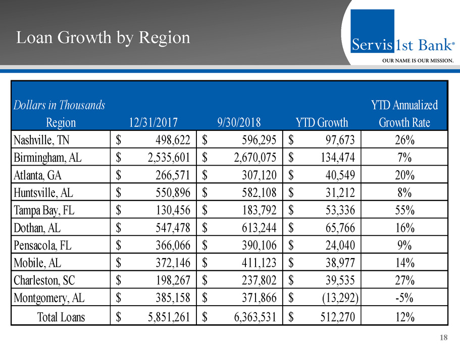 Loan Growth by Region 18 12/31/2017 9/30/2018 YTD Growth YTD Annualized Growth Rate 498,622$ 596,295$ 97,673$ 26% 2,535,601$ 2,670,075$ 134,474$ 7% 266,571$ 307,120$ 40,549$ 20% 550,896$ 582,108$ 31,212$ 8% 130,456$ 183,792$ 53,336$ 55% 547,478$ 613,244$ 65,766$ 16% 366,066$ 390,106$ 24,040$ 9% 372,146$ 411,123$ 38,977$ 14% 198,267$ 237,802$ 39,535$ 27% 385,158$ 371,866$ (13,292)$ -5% 5,851,261$ 6,363,531$ 512,270$ 12% Dollars in Thousands Region Total Loans Mobile, AL Atlanta, GA Charleston, SC Dothan, AL Tampa Bay, FL Huntsville, AL Pensacola, FL Montgomery, AL Birmingham, AL Nashville, TN