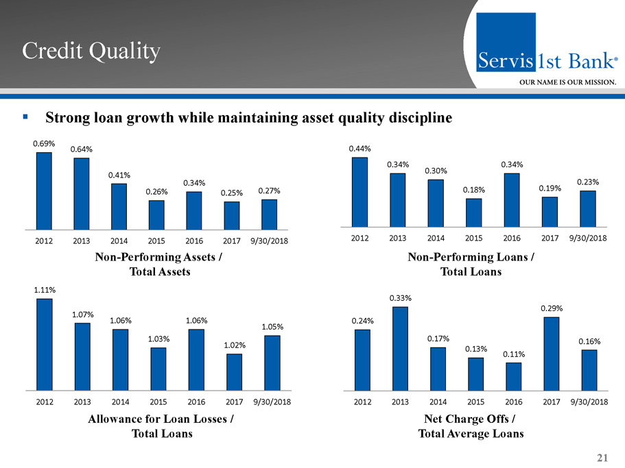 Credit Trends 20 (In Thousands) 2012 2013 2014 2015 2016 2017 9/30/2018 1-4 Family Construction Speculative 24,962$ 16,403$ 13,608$ 25,794$ 27,835$ 31,230$ 39,163$ 1-4 Family Construction Sold 21,607$ 21,414$ 28,124$ 29,086$ 45,051$ 47,441$ 43,387$ Resi Acquisition & Development 20,949$ 20,474$ 20,009$ 18,693$ 17,681$ 40,956$ 30,144$ Multifamily Permanent 39,800$ 38,601$ 54,725$ 71,217$ 92,052$ 127,502$ 149,477$ Residential Lot Loans 25,160$ 20,418$ 25,630$ 27,844$ 23,138$ 20,059$ 26,523$ Commercial Lots 10,054$ 9,479$ 16,007$ 17,986$ 25,618$ 31,601$ 44,537$ Raw Land 27,063$ 24,686$ 30,124$ 60,360$ 37,228$ 44,145$ 43,302$ Commercial Construction 26,565$ 50,389$ 76,904$ 72,807$ 158,537$ 365,442$ 316,555$ Other CRE Income Property 219,873$ 273,806$ 341,262$ 517,416$ 640,793$ 748,630$ 955,505$ Total CRE (Excluding O/O CRE) 416,034$ 475,671$ 606,394$ 841,203$ 1,067,930$ 1,457,006$ 1,648,593$ Total Risk-Based Capital 287,136$ 343,904$ 458,073$ 530,688$ 616,415$ 718,151$ 809,044$ CRE as % of Total Capital 145% 138% 132% 159% 173% 203% 204% Total Gross Loans 2,363,182$ 2,858,868$ 3,359,858$ 4,216,375$ 4,911,770$ 5,851,261$ 6,363,531$ CRE as % of Total Portfolio 18% 17% 18% 20% 22% 25% 26% CRE Owner Occupied 568,041$ 710,372$ 793,917$ 1,014,669$ 1,171,719$ 1,328,666$ 1,430,111$ CRE OO as % of Total Portfolio 24% 25% 24% 24% 24% 23% 22% CRE OO as % of Total Capital 198% 207% 173% 191% 190% 185% 177% AD&C 158,361$ 151,868$ 208,769$ 243,267$ 335,085$ 580,874$ 543,611$ AD&C as % of Total Capital 55% 44% 46% 46% 54% 81% 67% AD&C as % of Total Portfolio 7% 5% 6% 6% 7% 10% 9% Year Ended December 31, Commercial Real Estate Trends Acquisition, Development, & Construction Trends