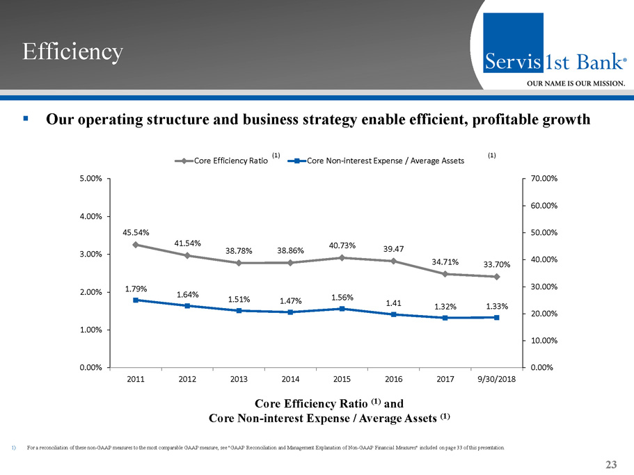 ▪ Consistent earnings results and strong momentum Profitability Metrics 22 Core Return on Average Assets (1) Core Return on Average Equity (1) Core Return on Average Common Equity (1) Net Interest Margin 1) For a reconciliation of these non - GAAP measures to the most comparable GAAP measure, see "GAAP Reconciliation and Management Exp lanation of Non - GAAP Financial Measures" included on page 33 of this presentation. . 1.30% 1.31% 1.44% 1.42% 1.42% 1.48% 1.90% 2012 2013 2014 2015 2016 2017 9/30/2018 19.41% 18.30% 18.30% 16.74% 15.73% 16.63% 20.88% 2012 2013 2014 2015 2016 2017 9/30/2018 3.80% 3.80% 3.68% 3.75% 3.42% 3.68% 3.80% 2012 2013 2014 2015 2016 2017 9/30/2018 15.81% 15.81% 15.54% 15.00% 14.96% 16.64% 20.89% 2012 2013 2014 2015 2016 2017 9/30/2018