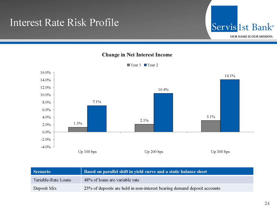 Interest Rate Risk Profile 24 Change in Net Interest Income Scenario Based on parallel shift in yield curve and a static balance sheet Variable - Rate Loans 48% of loans are variable rate Deposit Mix 23% of deposits are held in non - interest bearing demand deposit accounts 1.3% 2.1% 3.1% 7.1% 10.4% 14.1% -4.0% -2.0% 0.0% 2.0% 4.0% 6.0% 8.0% 10.0% 12.0% 14.0% 16.0% Up 100 bps Up 200 bps Up 300 bps Year 1 Year 2