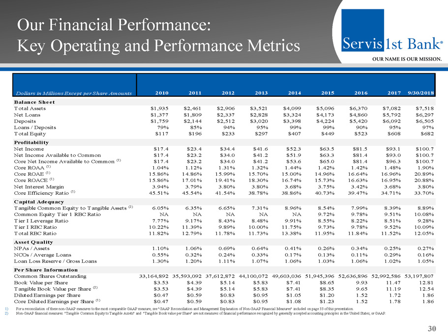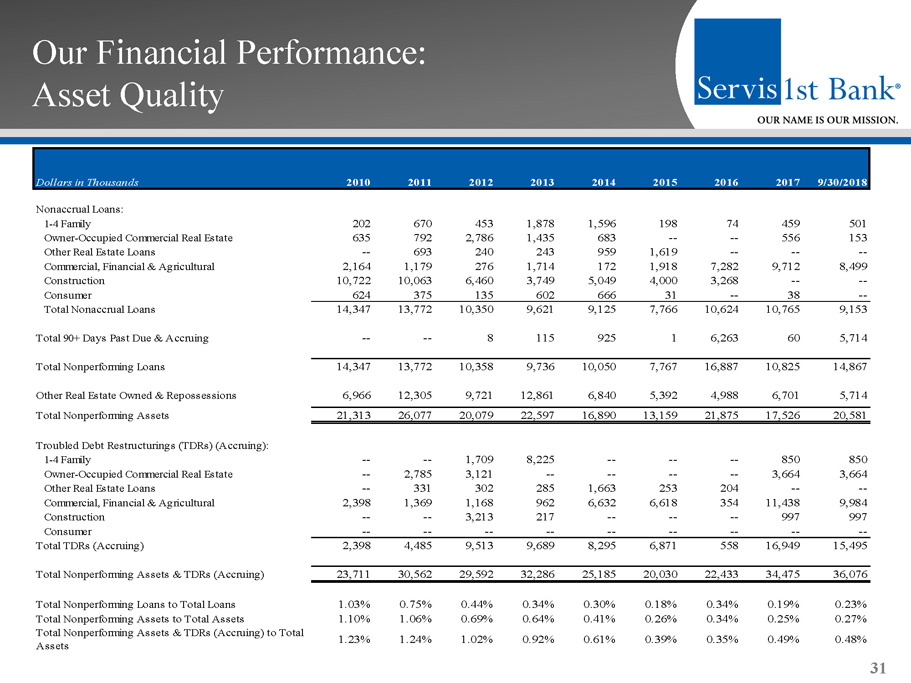 Our Financial Performance: Key Operating and Performance Metrics 30 2010 2011 2012 2013 2014 2015 2016 2017 9/30/2018 Balance Sheet Total Assets $1,935 $2,461 $2,906 $3,521 $4,099 $5,096 $6,370 $7,082 $7,518 Net Loans $1,377 $1,809 $2,337 $2,828 $3,324 $4,173 $4,860 $5,792 $6,297 Deposits $1,759 $2,144 $2,512 $3,020 $3,398 $4,224 $5,420 $6,092 $6,505 Loans / Deposits 79% 85% 94% 95% 99% 99% 90% 95% 97% Total Equity $117 $196 $233 $297 $407 $449 $523 $608 $682 Profitability Net Income $17.4 $23.4 $34.4 $41.6 $52.3 $63.5 $81.5 $93.1 $100.7 Net Income Available to Common $17.4 $23.2 $34.0 $41.2 $51.9 $63.3 $81.4 $93.0 $100.7 Core Net Income Available to Common (1) $17.4 $23.2 $34.0 $41.2 $53.6 $65.0 $81.4 $96.3 $100.7 Core ROAA (1) 1.04% 1.12% 1.31% 1.32% 1.44% 1.42% 1.42% 1.48% 1.90% Core ROAE (1) 15.86% 14.86% 15.99% 15.70% 15.00% 14.96% 16.64% 16.96% 20.89% Core ROACE (1) 15.86% 17.01% 19.41% 18.30% 16.74% 15.73% 16.63% 16.95% 20.88% Net Interest Margin 3.94% 3.79% 3.80% 3.80% 3.68% 3.75% 3.42% 3.68% 3.80% Core Efficiency Ratio (1) 45.51% 45.54% 41.54% 38.78% 38.86% 40.73% 39.47% 34.71% 33.70% Capital Adequacy Tangible Common Equity to Tangible Assets (2) 6.05% 6.35% 6.65% 7.31% 8.96% 8.54% 7.99% 8.39% 8.89% Common Equity Tier 1 RBC Ratio NA NA NA NA NA 9.72% 9.78% 9.51% 10.08% Tier I Leverage Ratio 7.77% 9.17% 8.43% 8.48% 9.91% 8.55% 8.22% 8.51% 9.28% Tier I RBC Ratio 10.22% 11.39% 9.89% 10.00% 11.75% 9.73% 9.78% 9.52% 10.09% Total RBC Ratio 11.82% 12.79% 11.78% 11.73% 13.38% 11.95% 11.84% 11.52% 12.05% Asset Quality NPAs / Assets 1.10% 1.06% 0.69% 0.64% 0.41% 0.26% 0.34% 0.25% 0.27% NCOs / Average Loans 0.55% 0.32% 0.24% 0.33% 0.17% 0.13% 0.11% 0.29% 0.16% Loan Loss Reserve / Gross Loans 1.30% 1.20% 1.11% 1.07% 1.06% 1.03% 1.06% 1.02% 1.05% Per Share Information Common Shares Outstanding 33,164,892 35,593,092 37,612,872 44,100,072 49,603,036 51,945,396 52,636,896 52,992,586 53,197,807 Book Value per Share $3.53 $4.39 $5.14 $5.83 $7.41 $8.65 9.93 11.47 12.81 Tangible Book Value per Share (2) $3.53 $4.39 $5.14 $5.83 $7.41 $8.35 9.65 11.19 12.54 Diluted Earnings per Share $0.47 $0.59 $0.83 $0.95 $1.05 $1.20 1.52 1.72 1.86 Core Diluted Earnings per Share (1) $0.47 $0.59 $0.83 $0.95 $1.08 $1.23 1.52 1.78 1.86 Dollars in Millions Except per Share Amounts 1) For a reconciliation of these non - GAAP measures to the most comparable GAAP measure, see "GAAP Reconciliation and Management Exp lanation of Non - GAAP Financial Measures" included on page 33 of this presentation. 2) Non - GAAP financial measures. "Tangible Common Equity to Tangible Assets" and "Tangible Book value per Share" are not measures o f financial performance recognized by generally accepted accounting principles in the United States, or GAAP.