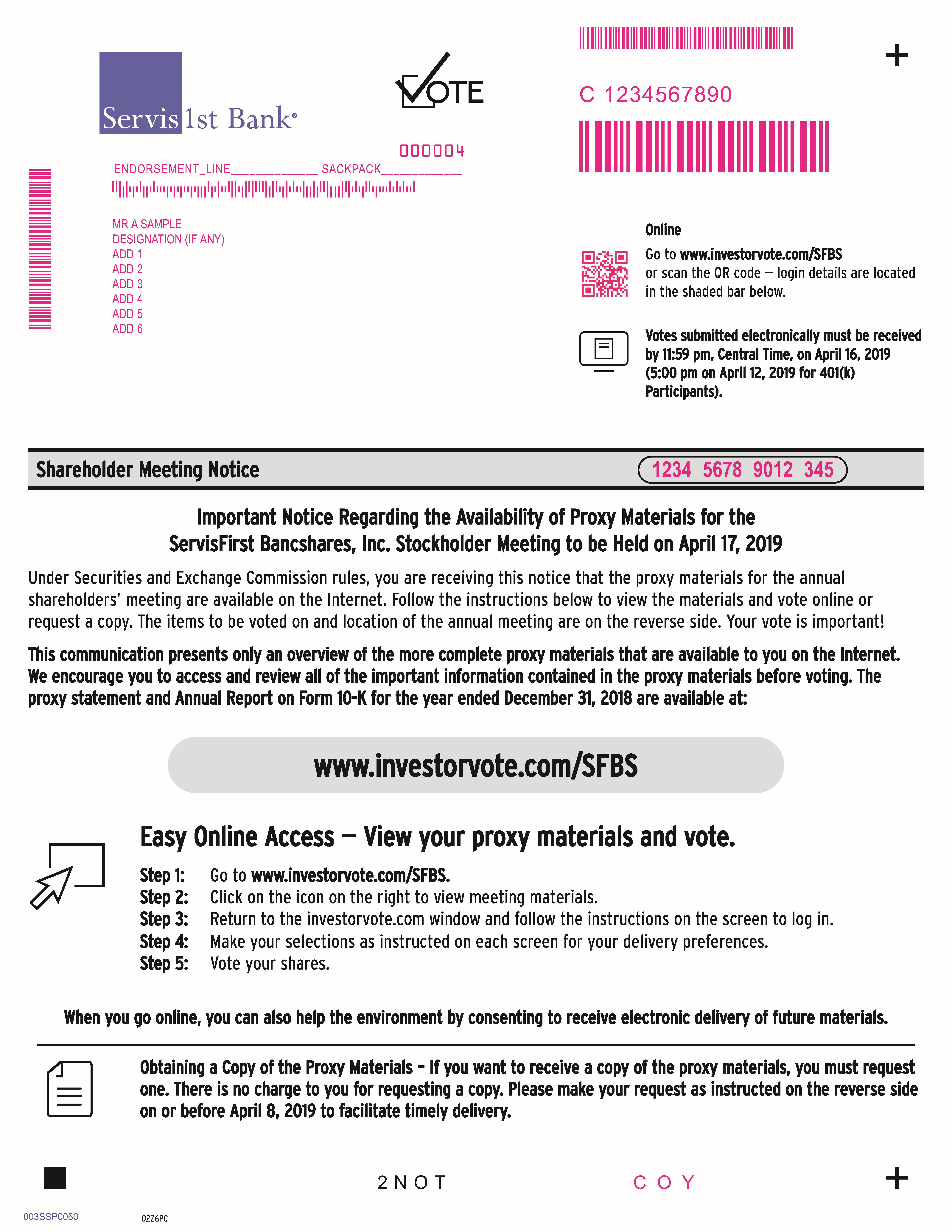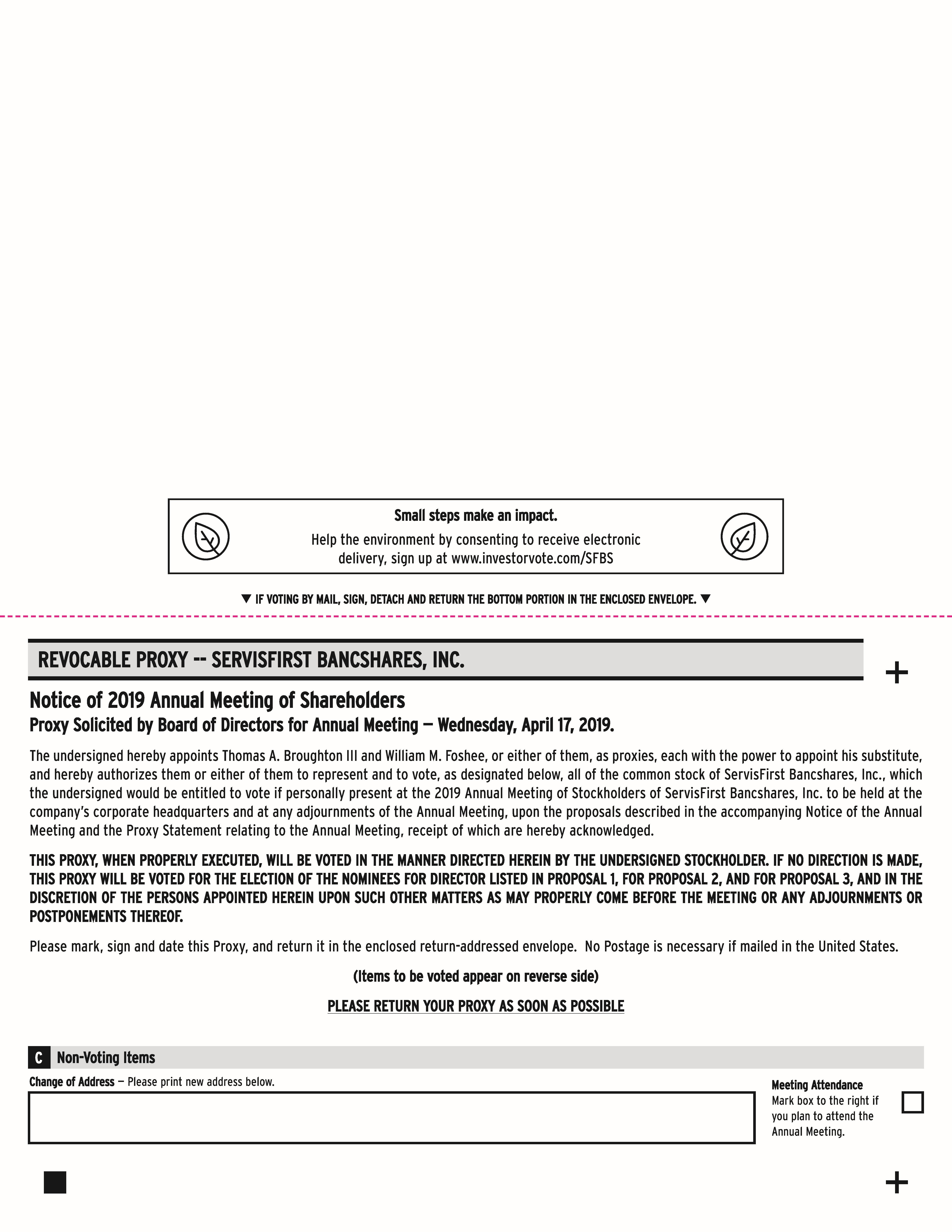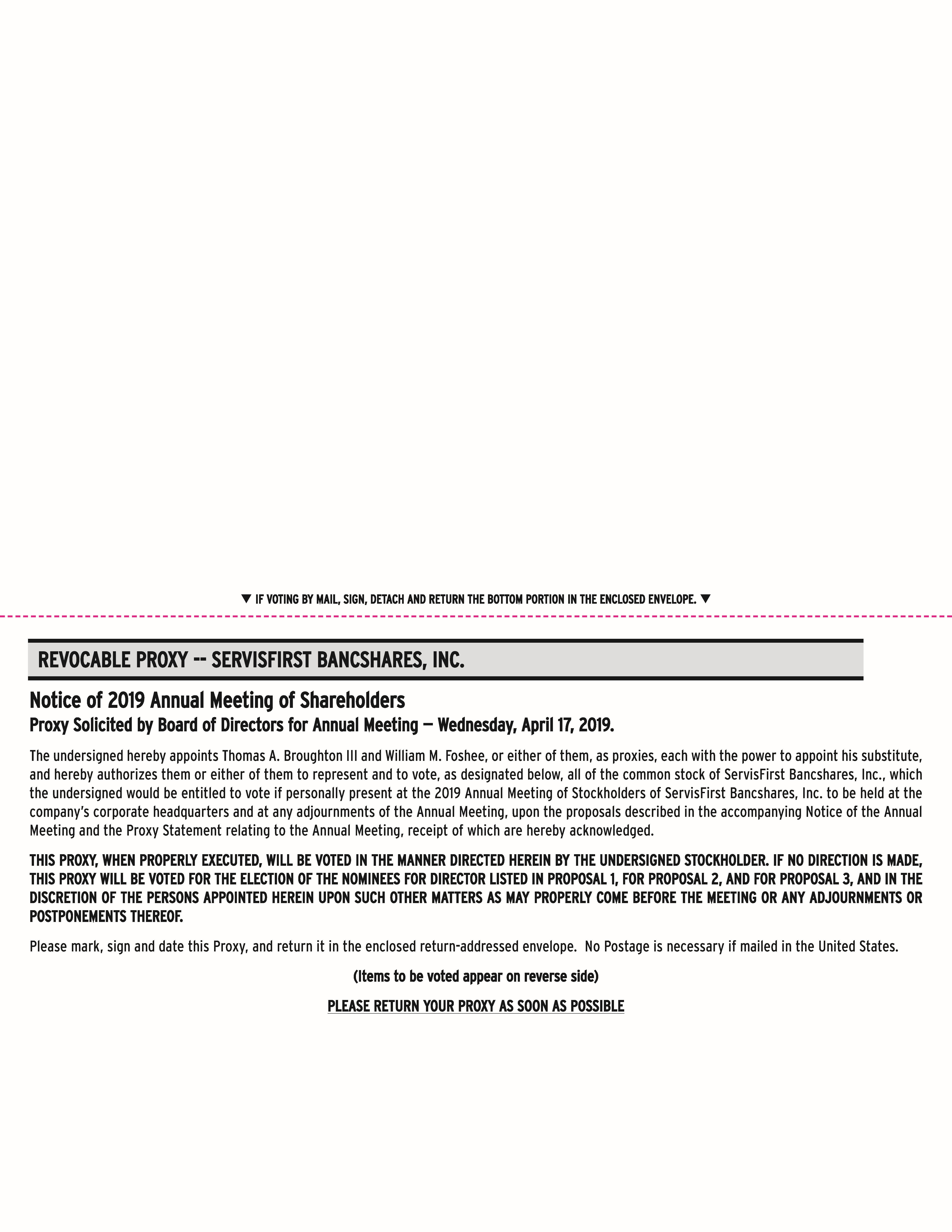 You are cordially invited to attend the Annual Meeting of Stockholders of ServisFirst Bancshares, Inc. Our Annual Meeting will be held at the company’s corporate headquarters, located at 2500 Woodcrest Place, Birmingham, Alabama 35209, on April 17, 2019, at 9:00 a.m., Central Daylight Time.