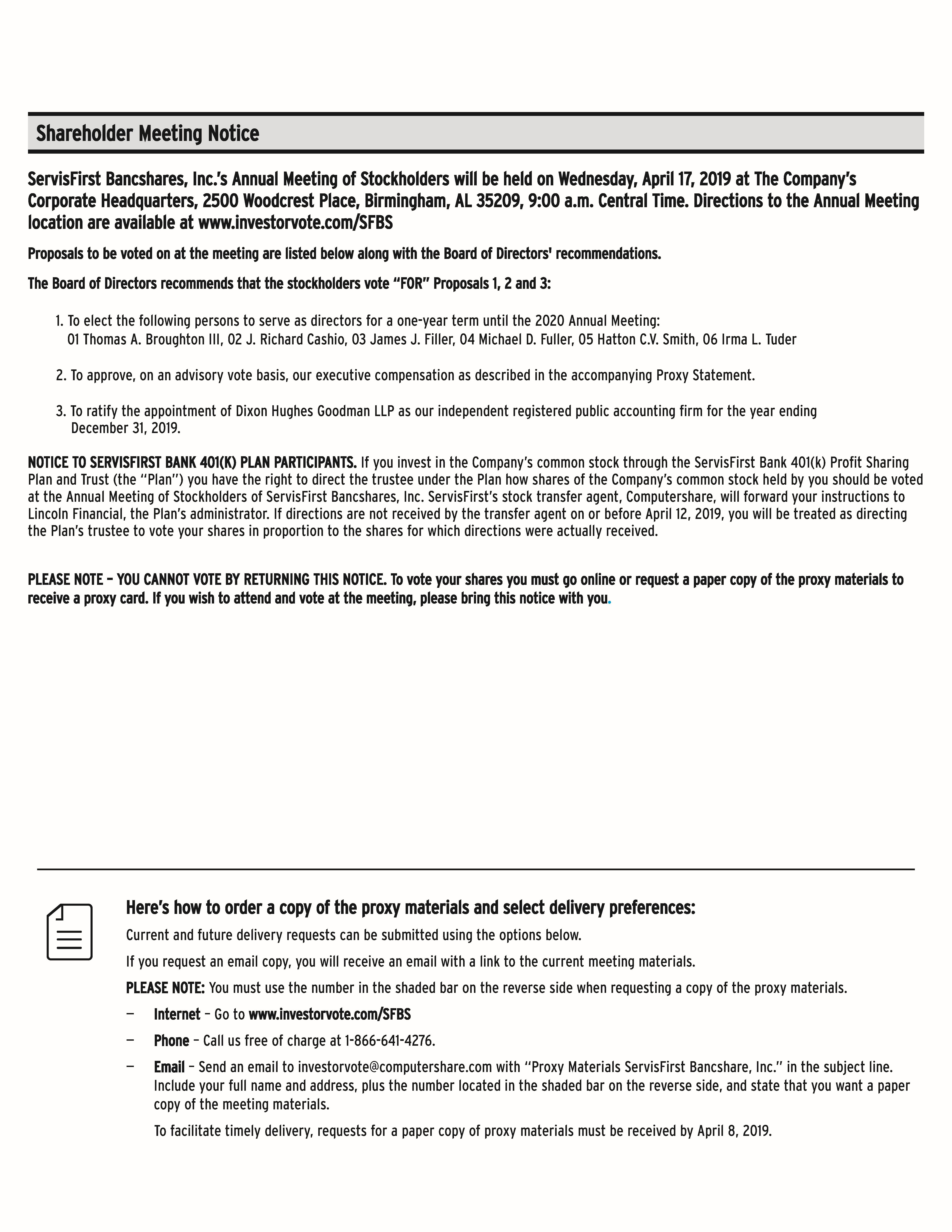 To request a printed copy of the proxy materials, please call 1-866-641-4276, visit www.investorvote.com/SFBS or email investorvote@computershare.com with “Proxy Materials ServisFirst Bancshares, Inc.” in the subject line. To make your request, you will need the 15-digit control number printed on your Notice of Internet Availability of Proxy Materials or proxy card.