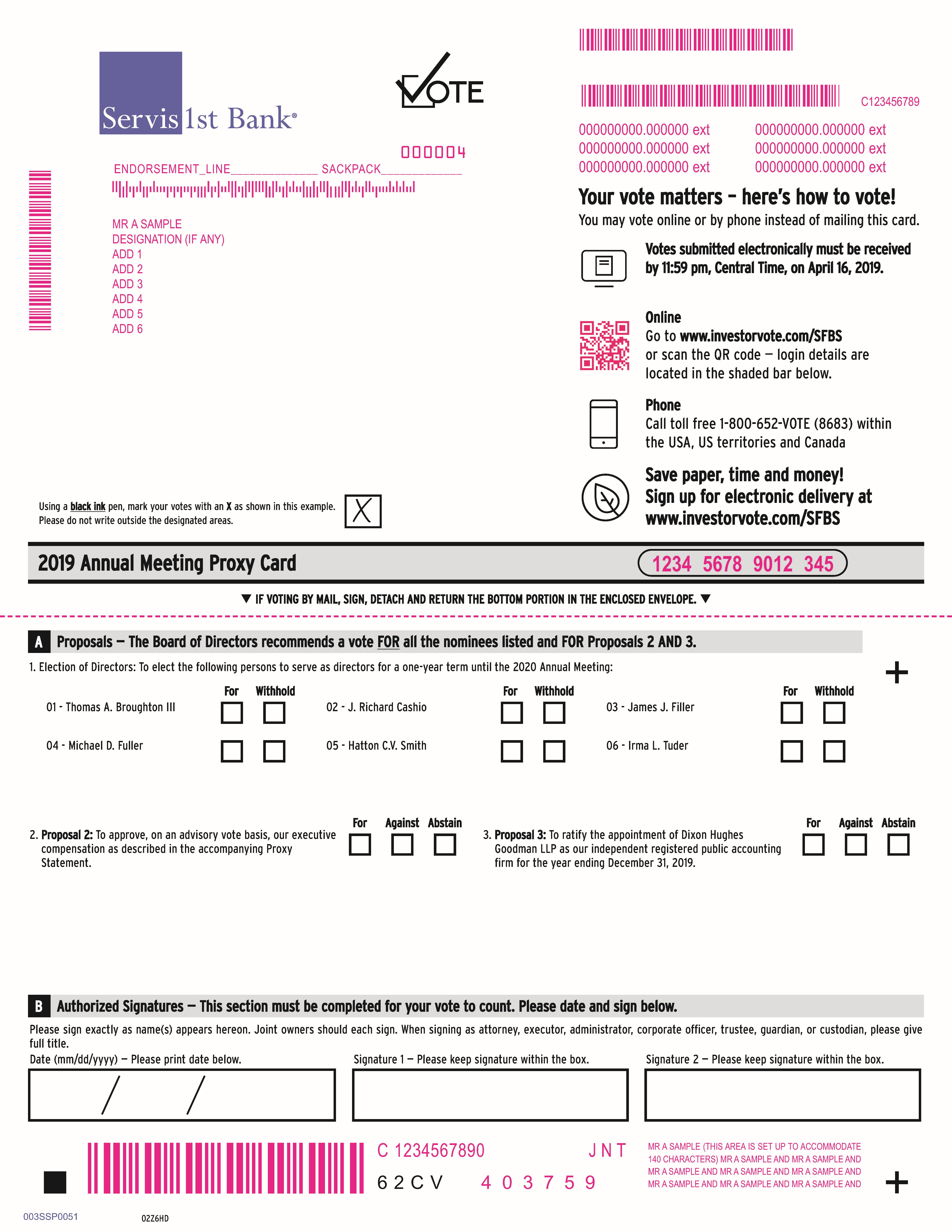 | • | By going to the website www.investorvote.com/SFBS and following the instructions for Internet voting on the proxy card or Notice of Internet Availability of Proxy Materials that you received in the mail. You will need the 15-digit control number printed therein. You may also access instructions for telephone voting on the website. |