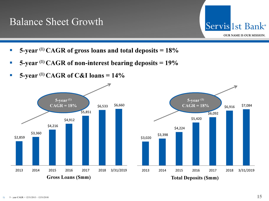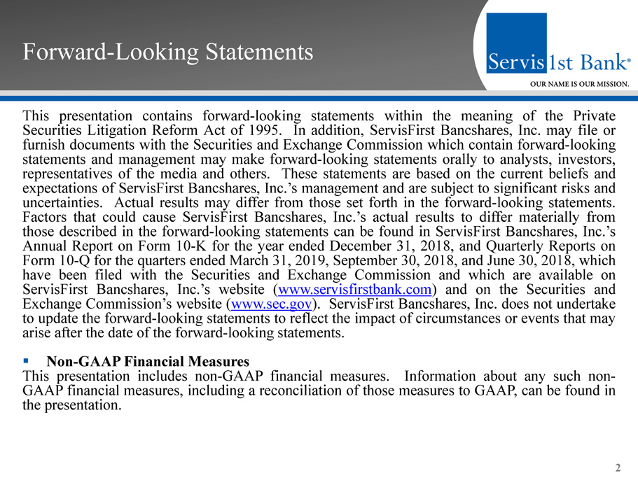 Forward - Looking Statements This presentation contains forward - looking statements within the meaning of the Private Securities Litigation Reform Act of 1995 . In addition, ServisFirst Bancshares, Inc . may file or furnish documents with the Securities and Exchange Commission which contain forward - looking statements and management may make forward - looking statements orally to analysts, investors, representatives of the media and others . These statements are based on the current beliefs and expectations of ServisFirst Bancshares, Inc . ’s management and are subject to significant risks and uncertainties . Actual results may differ from those set forth in the forward - looking statements . Factors that could cause ServisFirst Bancshares, Inc . ’s actual results to differ materially from those described in the forward - looking statements can be found in ServisFirst Bancshares, Inc . ’s Annual Report on Form 10 - K for the year ended December 31 , 2018 , and Quarterly Reports on Form 10 - Q for the quarters ended March 31 , 2019 , September 30 , 2018 , and June 30 , 2018 , which have been filed with the Securities and Exchange Commission and which are available on ServisFirst Bancshares, Inc . ’s website ( www . servisfirstbank . com ) and on the Securities and Exchange Commission’s website ( www . sec . gov ) . ServisFirst Bancshares, Inc . does not undertake to update the forward - looking statements to reflect the impact of circumstances or events that may arise after the date of the forward - looking statements . ▪ Non - GAAP Financial Measures This presentation includes non - GAAP financial measures . Information about any such non - GAAP financial measures, including a reconciliation of those measures to GAAP, can be found in the presentation . 2