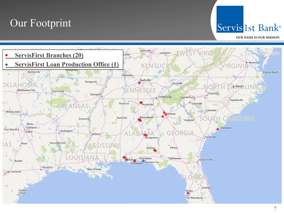 Our Footprint 7 ServisFirst Branches (20) ServisFirst Loan Production Office (1)