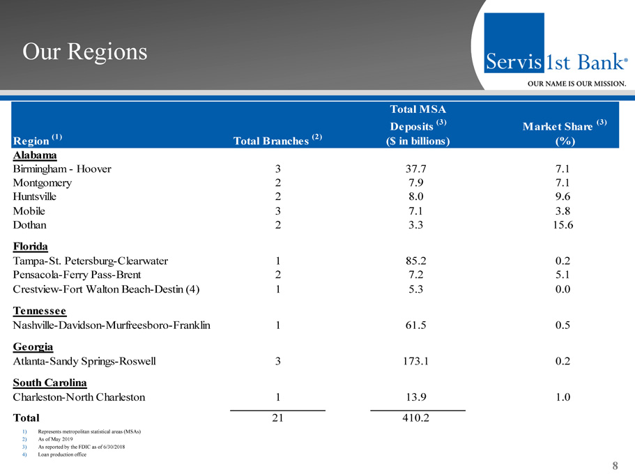 Milestones 6 ▪ Founded in May 2005 with initial capital raise of $35 million ▪ Reached profitability during the fourth quarter of 2005 and have been profitable every quarter since ▪ Achieved total asset milestones of $1 billion in 2008, $2 billion in 2011, $3 billion in 2013, $4 billion in 2014, $5 billion in 2015, $6 billion in 2016, $7 billion in 2017, and $8 billion in 2018 2014 May ’05: Founded in Birmingham, AL June ’07: Montgomery, AL March ’11: Correspondent Banking April ’13: Mobile, AL May ’14: NASDAQ listed August ’06: Huntsville, AL September ’08: Dothan, AL April ’11: Pensacola, FL April ’13: Nashville, TN February ‘15: Metro Bank Acquisition January ’15: Charleston, SC 2015 2012 2013 2011 2010 2009 2008 2007 2006 2005 January ’16: Tampa Bay, FL 2017 2016 2018