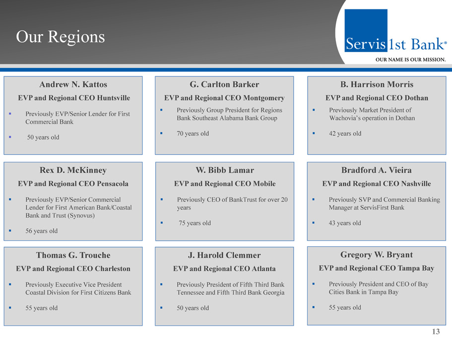 Our Management Team Thomas A. Broughton, III President and Chief Executive Officer ▪ Previously President and CEO of First Commercial Bank (acquired by Synovus Financial, 1992); subsequently, regional CEO for Synovus ▪ American Banker’s 2009 Community Banker of the Year ▪ 63 years old 12 William M. Foshee EVP and Chief Financial Officer ▪ Previously Chief Financial Officer of Heritage Financial Holding Corporation ▪ Certified public accountant ▪ 64 years old Clarence C. Pouncey , III EVP and Chief Operating Officer ▪ Previously with Wachovia; oversaw production functions in Alabama, Arizona, Tennessee and Texas ▪ Previously SVP of SouthTrust Bank ▪ 62 years old Henry F. Abbott SVP and Chief Credit Officer ▪ Previously Senior Vice President and Chief Credit Officer of the Correspondent Banking Division, ServisFirst Bank ▪ 38 years old Rodney E. Rushing EVP, Correspondent Banking Executive ▪ Previously Executive Vice President of Correspondent Banking, BBVA - Compass ▪ 61 years old ▪ Insiders own approximately 13% of outstanding shares