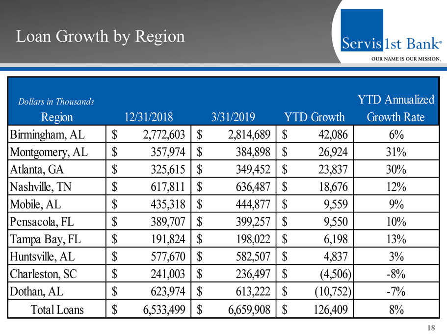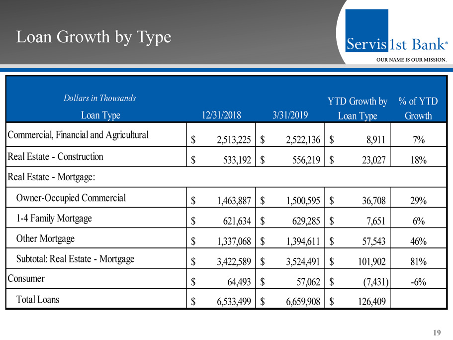 Loan Growth by Region 18 12/31/2018 3/31/2019 YTD Growth YTD Annualized Growth Rate 2,772,603$ 2,814,689$ 42,086$ 6% 357,974$ 384,898$ 26,924$ 31% 325,615$ 349,452$ 23,837$ 30% 617,811$ 636,487$ 18,676$ 12% 435,318$ 444,877$ 9,559$ 9% 389,707$ 399,257$ 9,550$ 10% 191,824$ 198,022$ 6,198$ 13% 577,670$ 582,507$ 4,837$ 3% 241,003$ 236,497$ (4,506)$ -8% 623,974$ 613,222$ (10,752)$ -7% 6,533,499$ 6,659,908$ 126,409$ 8% Dollars in Thousands Region Total Loans Mobile, AL Atlanta, GA Charleston, SC Dothan, AL Tampa Bay, FL Huntsville, AL Pensacola, FL Montgomery, AL Birmingham, AL Nashville, TN