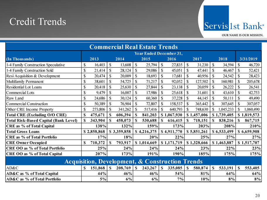 Credit Trends 20 (In Thousands) 2013 2014 2015 2016 2017 2018 3/31/2019 1-4 Family Construction Speculative 16,403$ 13,608$ 25,794$ 27,835$ 31,230$ 34,594$ 46,720$ 1-4 Family Construction Sold 21,414$ 28,124$ 29,086$ 45,051$ 47,441$ 46,467$ 52,421$ Resi Acquisition & Development 20,474$ 20,009$ 18,693$ 17,681$ 40,956$ 24,542$ 28,423$ Multifamily Permanent 38,601$ 54,725$ 71,217$ 92,052$ 127,502$ 160,981$ 205,678$ Residential Lot Loans 20,418$ 25,630$ 27,844$ 23,138$ 20,059$ 26,222$ 26,541$ Commercial Lots 9,479$ 16,007$ 17,986$ 25,618$ 31,601$ 43,610$ 42,753$ Raw Land 24,686$ 30,124$ 60,360$ 37,228$ 44,145$ 50,111$ 49,490$ Commercial Construction 50,389$ 76,904$ 72,807$ 158,537$ 365,442$ 307,645$ 307,057$ Other CRE Income Property 273,806$ 341,262$ 517,416$ 640,793$ 748,630$ 1,045,233$ 1,060,490$ Total CRE (Excluding O/O CRE) 475,671$ 606,394$ 841,203$ 1,067,930$ 1,457,006$ 1,739,405$ 1,819,573$ Total Risk-Based Capital (Bank Level) 343,904$ 458,073$ 530,688$ 616,415$ 718,151$ 838,216$ 867,715$ CRE as % of Total Capital 138% 132% 159% 173% 203% 208% 210% Total Gross Loans 2,858,868$ 3,359,858$ 4,216,375$ 4,911,770$ 5,851,261$ 6,533,499$ 6,659,908$ CRE as % of Total Portfolio 17% 18% 20% 22% 25% 27% 27% CRE Owner Occupied 710,372$ 793,917$ 1,014,669$ 1,171,719$ 1,328,666$ 1,463,887$ 1,517,707$ CRE OO as % of Total Portfolio 25% 24% 24% 24% 23% 22% 23% CRE OO as % of Total Capital 207% 173% 191% 190% 185% 175% 175% AD&C 151,868$ 208,769$ 243,267$ 335,085$ 580,874$ 533,191$ 553,405$ AD&C as % of Total Capital 44% 46% 46% 54% 81% 64% 64% AD&C as % of Total Portfolio 5% 6% 6% 7% 10% 8% 8% Commercial Real Estate Trends Acquisition, Development, & Construction Trends Year Ended December 31,
