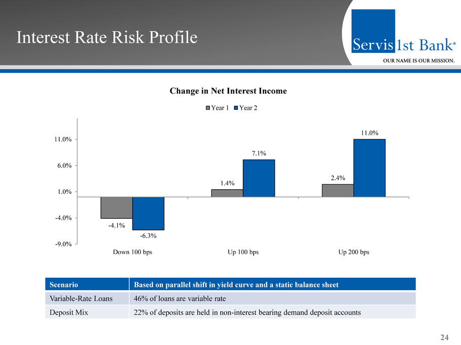 ▪ Our operating structure and business strategy enable efficient, profitable growth Efficiency 23 Core Efficiency Ratio (1) and Core Non - interest Expense / Average Assets (1) (1) (1) 45.54% 41.54% 38.69% 38.75% 40.60% 39.47 34.71% 32.57% 34.35% 1.79% 1.64% 1.51% 1.47% 1.55% 1.41 1.32% 1.26% 1.26% 0.00% 1.00% 2.00% 3.00% 4.00% 5.00% 2011 2012 2013 2014 2015 2016 2017 2018 2019 0.00% 10.00% 20.00% 30.00% 40.00% 50.00% 60.00% 70.00% Core Efficiency Ratio Core Non-interest Expense / Average Assets 1) For a reconciliation of these non - GAAP measures to the most comparable GAAP measure, see "GAAP Reconciliation and Management Explanation of Non - GAAP Financial Measures" included on page 32 of this presentation .