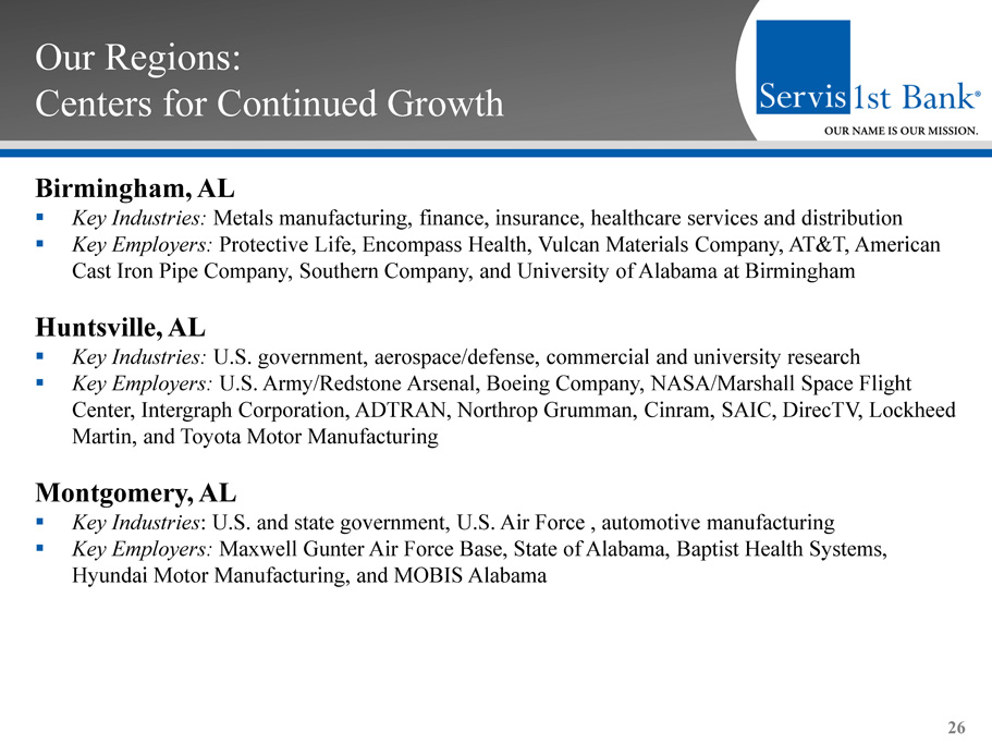 Our Regions Rex D. McKinney EVP and Regional CEO Pensacola ▪ Previously EVP/Senior Commercial Lender for First American Bank/Coastal Bank and Trust ( Synovus ) ▪ 56 years old 13 Andrew N. Kattos EVP and Regional CEO Huntsville ▪ Previously EVP/Senior Lender for First Commercial Bank ▪ 50 years old J. Harold Clemmer EVP and Regional CEO Atlanta ▪ Previously President of Fifth Third Bank Tennessee and Fifth Third Bank Georgia ▪ 50 years old W. Bibb Lamar EVP and Regional CEO Mobile ▪ Previously CEO of BankTrust for over 20 years ▪ 75 years old G. Carlton Barker EVP and Regional CEO Montgomery ▪ Previously Group President for Regions Bank Southeast Alabama Bank Group ▪ 70 years old B. Harrison Morris EVP and Regional CEO Dothan ▪ Previously Market President of Wachovia’s operation in Dothan ▪ 42 years old Gregory W. Bryant EVP and Regional CEO Tampa Bay ▪ Previously President and CEO of Bay Cities Bank in Tampa Bay ▪ 55 years old Thomas G. Trouche EVP and Regional CEO Charleston ▪ Previously Executive Vice President Coastal Division for First Citizens Bank ▪ 55 years old Bradford A. Vieira EVP and Regional CEO Nashville ▪ Previously SVP and Commercial Banking Manager at ServisFirst Bank ▪ 43 years old