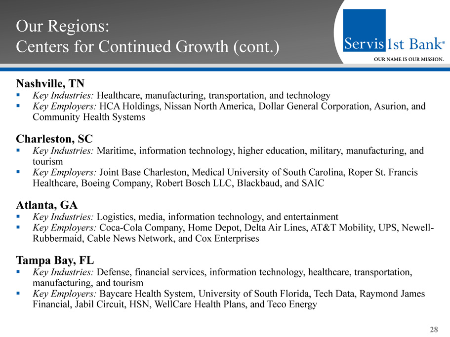 Our Regions: Centers for Continued Growth (cont.) Dothan, AL ▪ Key Industries: Agriculture, manufacturing, and healthcare services ▪ Key Employers: Southeast Alabama Medical Center, Wayne Farms, Southern Nuclear, Michelin Tire, Pemco World Air Services, Globe Motors, and AAA Cooper Transportation Pensacola, FL ▪ Key Industries: Military, health services, medical technology industries, and tourism ▪ Key Employers: Eglin Air Force Base, Hurlburt Field, Pensacola Whiting Field, Pensacola Naval Air Station and Corry Station, Sacred Heart Health System, West Florida Regional Hospital, Gulf Power Company, University of West Florida, Solutia, and GE Wind Energy Mobile, AL ▪ Key Industries: Aircraft assembly, aerospace, steel, ship building, maritime, construction, medicine, and manufacturing ▪ Key Employers: Port of Mobile, Infirmary Health Systems, Austal USA, Brookley Aeroplex , ThyssenKrupp, Infirmary Health Systems, University of South Alabama, ST Aerospace Mobile, and EADS 27