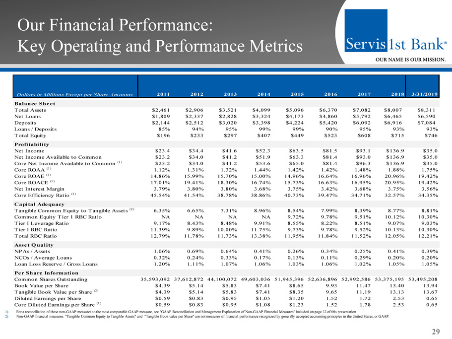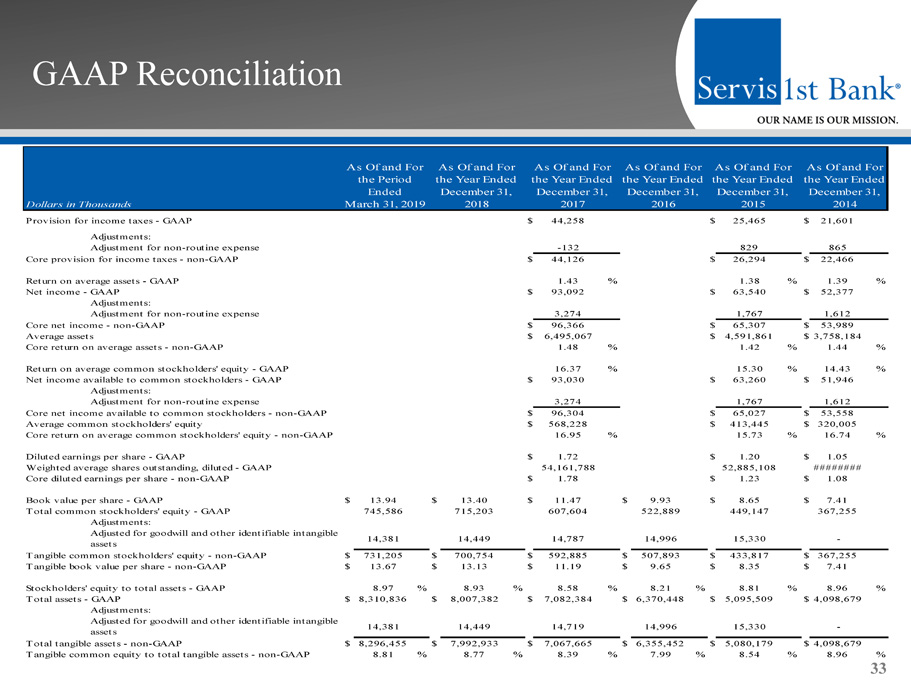GAAP Reconciliation and Management Explanation of Non - GAAP Financial Measures 32 We recorded $3.1 million of additional tax expense as a result of revaluing our net deferred tax assets at December 31, 2017 due to lower corporate income tax rates provided by the Tax Cuts and Jobs Act passed into law in December 2017. We also recorded expenses of $347,000 related to terminating the lease agreement on our previous headquarters building in Birmingham, Alabama and expenses of moving into our new headquarters building. We recorded expenses of $2.1 million for the first quarter of 2015 re lat ed to the acquisition of Metro Bancshares, Inc. and the merger of Metro Bank with and into the bank, and recorded an expense of $50 0,0 00 resulting from the initial funding of reserves for unfunded loan commitments for the first quarter of 2015, consistent with g uid ance provided in the Federal Reserve Bank’s Interagency Policy Statement SR 06 - 17. Core financial measures included in this presenta tion are “core net income available to common stockholders,” “core earnings per share, basic,” “core earnings per share, diluted,” “c ore return on average assets,” “core return on average stockholders’ equity,” “core return on average common stockholders’ equity ” a nd “core efficiency ratio.” Each of these seven core financial measures excludes the impact of the non - routine expense attributabl e to the revaluing of our net deferred tax assets, lease termination, moving expenses, expenses related to the acquisition of Metro an d t he initial funding of reserves for unfunded loan commitments. In addition to these financial measures adjusting for non - routine expenses, t his presentation contains certain non - GAAP financial measures, including tangible book value per share and tangible common equity to total tangible assets, each of which excludes goodwill and core deposit intangibles associated with our acquisition of Metro Bancshares, Inc. in January 2015. We believe these non - GAAP financial measures provide useful information to management and investors that is supplementary to our financial condition, results of operations and cash flows computed in accordance with GAA P; however, we acknowledge that these non - GAAP financial measures have a number of limitations. As such, you should not view these disclosures as a substitute for results determined in accordance with GAAP, and they are not necessarily comparable to non - GAAP financial measures that other companies, including those in our industry, use. The following reconciliation table provides a mo re detailed analysis of the non - GAAP financial measures for March 31,2019 and the years ended December 31, 2018, 2017, 2016, 2015, and 2014. All amounts are in thousands, except share and per share data.