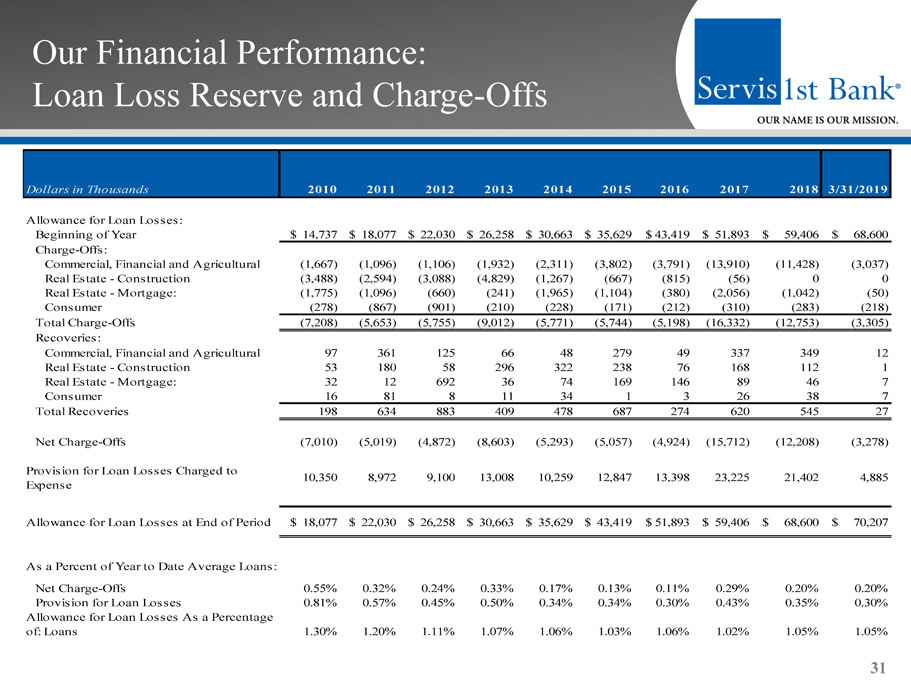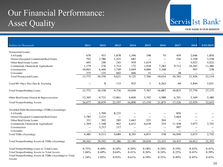 Our Financial Performance: Asset Quality 30 Dollars in Thousands 2011 2012 2013 2014 2015 2016 2017 2018 3/31/2019 Nonaccrual Loans: 1-4 Family 670 453 1,878 1,596 198 74 459 2,046 1,850 Owner-Occupied Commercial Real Estate 792 2,786 1,435 683 -- -- 556 3,358 3,558 Other Real Estate Loans 693 240 243 959 1,619 -- -- 5,022 5,022 Commercial, Financial & Agricultural 1,179 276 1,714 172 1,918 7,282 9,712 10,503 11,486 Construction 10,063 6,460 3,749 5,049 4,000 3,268 -- 997 238 Consumer 375 135 602 666 31 -- 38 -- -- Total Nonaccrual Loans 13,772 10,350 9,621 9,125 7,766 10,624 10,765 21,926 22,154 Total 90+ Days Past Due & Accruing -- 8 115 925 1 6,263 60 5,844 5,021 Total Nonperforming Loans 13,772 10,358 9,736 10,050 7,767 16,887 10,825 27,770 27,175 Other Real Estate Owned & Repossessions 12,305 9,721 12,861 6,840 5,392 4,988 6,701 5,169 5,480 Total Nonperforming Assets 26,077 20,079 22,597 16,890 13,159 21,875 17,526 32,939 32,655 Troubled Debt Restructurings (TDRs) (Accruing): 1-4 Family -- 1,709 8,225 -- -- -- 850 -- -- Owner-Occupied Commercial Real Estate 2,785 3,121 -- -- -- -- 3,664 -- -- Other Real Estate Loans 331 302 285 1,663 253 204 -- -- -- Commercial, Financial & Agricultural 1,369 1,168 962 6,632 6,618 354 11,438 3,073 2,742 Construction -- 3,213 217 -- -- -- 997 -- -- Consumer -- -- -- -- -- -- -- -- -- Total TDRs (Accruing) 4,485 9,513 9,689 8,295 6,871 558 16,949 3,073 2,742 Total Nonperforming Assets & TDRs (Accruing) 30,562 29,592 32,286 25,185 20,030 22,433 34,475 36,012 35,397 Total Nonperforming Loans to Total Loans 0.75% 0.44% 0.34% 0.30% 0.18% 0.34% 0.19% 0.43% 0.41% Total Nonperforming Assets to Total Assets 1.06% 0.69% 0.64% 0.41% 0.26% 0.34% 0.25% 0.41% 0.39% Total Nonperforming Assets & TDRs (Accruing) to Total Assets 1.24% 1.02% 0.92% 0.61% 0.39% 0.35% 0.49% 0.45% 0.43%