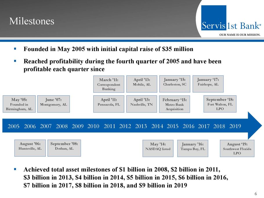 Opportunistic Expansion ▪ Identify great bankers in attractive markets – Focus on people as opposed to places – Target minimum of $300 million in assets within 3 years – Best bankers in growing markets ▪ Market strategies – Regional CEOs execute simple business model – Back office support and risk management infrastructure – Non - legal board of directors comprised of key business people – Provide professional banking services to mid - market commercial customers that have been neglected or pushed down to branch personnel by national and other larger regional banks ▪ Opportunistic future expansion – Southern markets, metropolitan focus – Draw on expertise of industry contacts 5