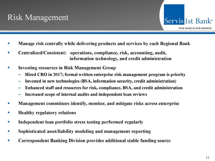 Scalable, Decentralized Structure ▪ Local decision - making – Emphasize local decision - making to drive customer revenue – Centralized, uniform risk management and support – Conservative local lending authorities, covers most lending decisions ▪ Geographic organizational structure (as opposed to line of business structure) ▪ Regional CEOs empowered and held accountable – Utilize stock based compensation to align goals ▪ Top - down sales culture – Senior management actively involved in customer acquisition 10