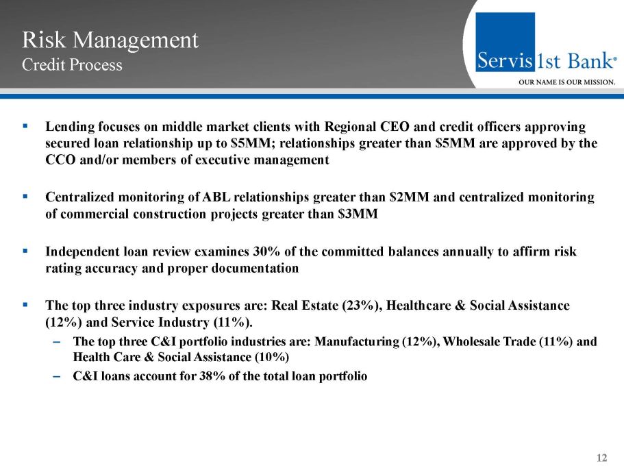 Risk Management ▪ Manage risk centrally while delivering products and services by each Regional Bank ▪ Centralized/Consistent: operations, compliance, risk, accounting, audit, information technology, and credit administration ▪ Investing resources in Risk Management Group – Hired CRO in 2017; formal written enterprise risk management program is priority – Invested in new technologies (BSA, information security, credit administration) – Enhanced staff and resources for risk, compliance, BSA, and credit administration – Increased scope of internal audits and independent loan reviews ▪ Management committees identify, monitor, and mitigate risks across enterprise ▪ Healthy regulatory relations ▪ Independent loan portfolio stress testing performed regularly ▪ Sophisticated asset/liability modeling and management reporting ▪ Correspondent Banking Division provides additional stable funding source 11